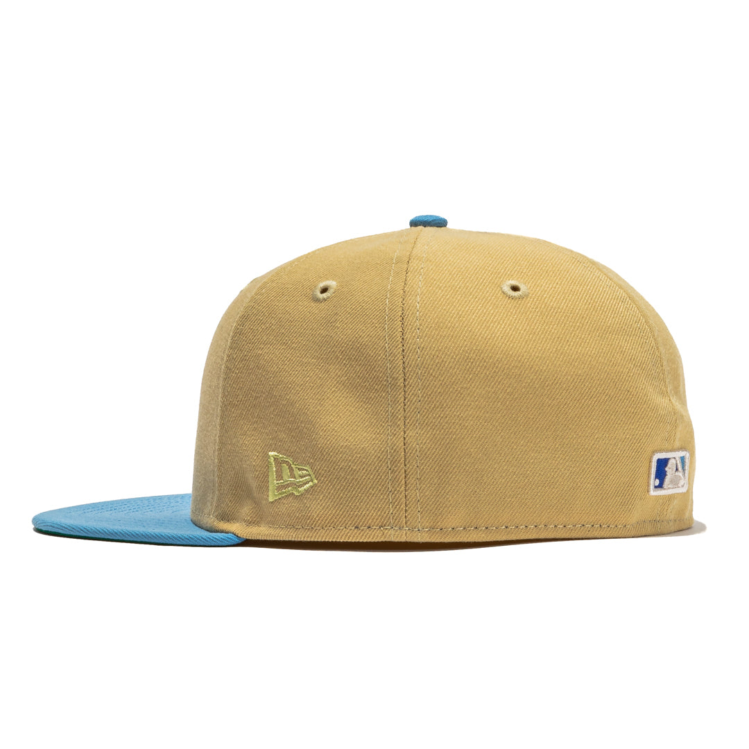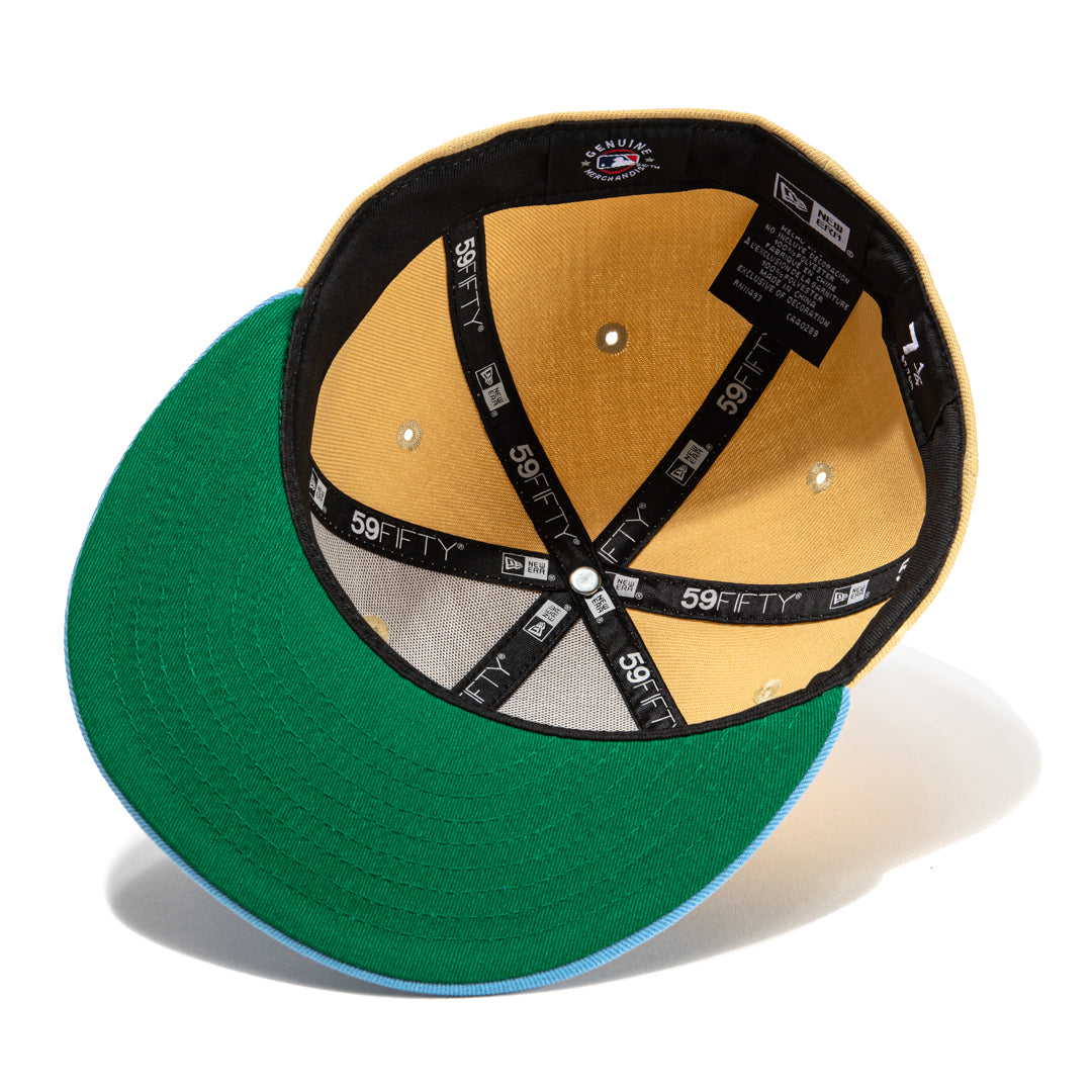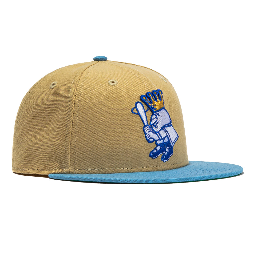 This New Era Kansas City Royals 59FIFTY fitted hat has a tan/stone six panel structured high crown, embroidered eyelets and a black fabric squatchee button. The fitted cap also has a kelly green undervisor and a black sweatband. The front panel features the Kansas City Royals logo embroidery and a side patch embroidery on the right panel. The left panel of the fitted displays the New Era logo and the official MLB logo embroidery on the rear crown.