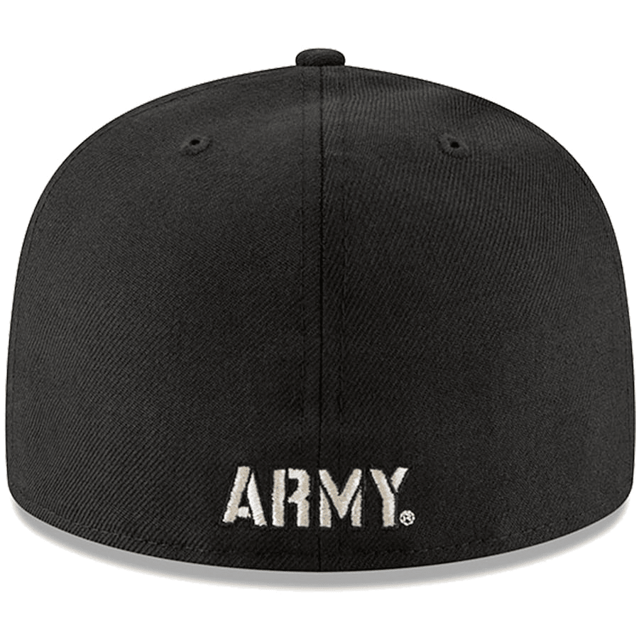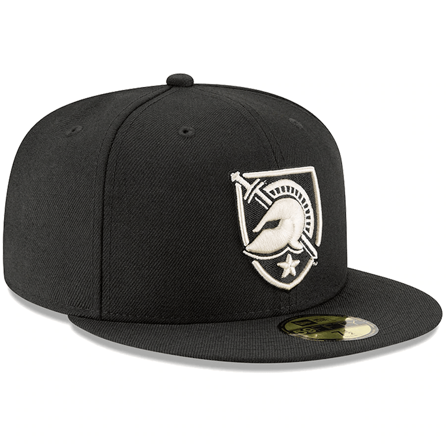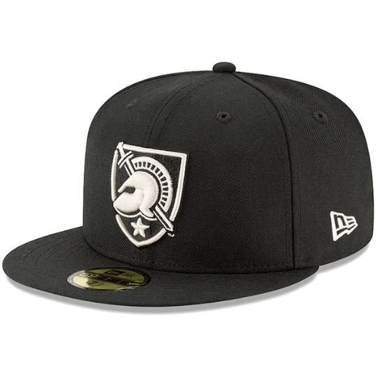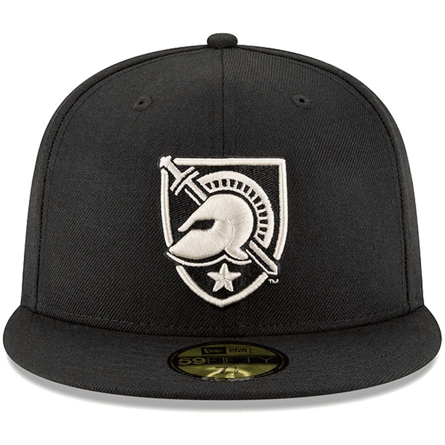 The New Era Army West Point Black Knights 59Fifty fitted hat is solid black including the under brim. The front logo displays the Army West Point Black Knights embroidery. The left side of the fitted is the new Era flag in embroidered in white. The back of the fitted is the word Army. Straightforward Army West Point Black Knights hat for fans of the NCAA team looking to show support.