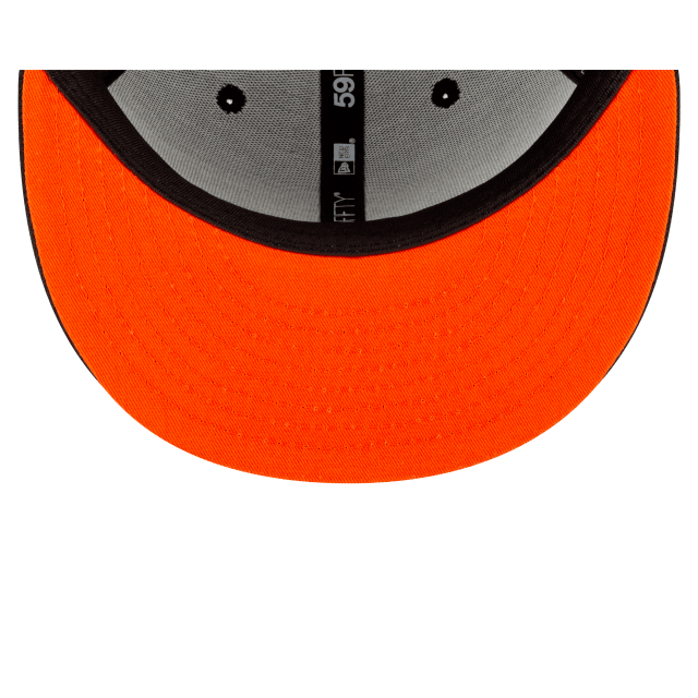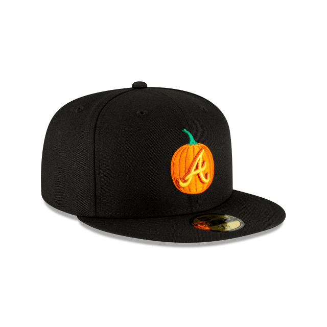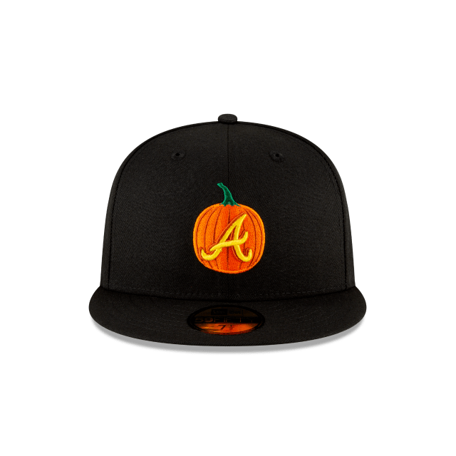 The Atlanta Braves Carved Pumpkins 59FIFTY Fittted Hat features an embroidered Braves logo "carved" into a pumpkin at the front panels with an orange under visor and an MLB Batterman embroidered at the rear.