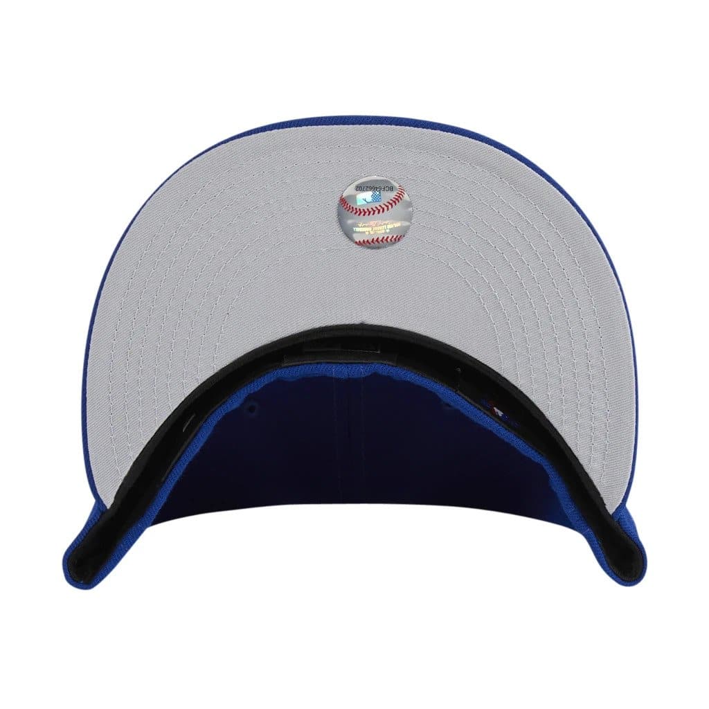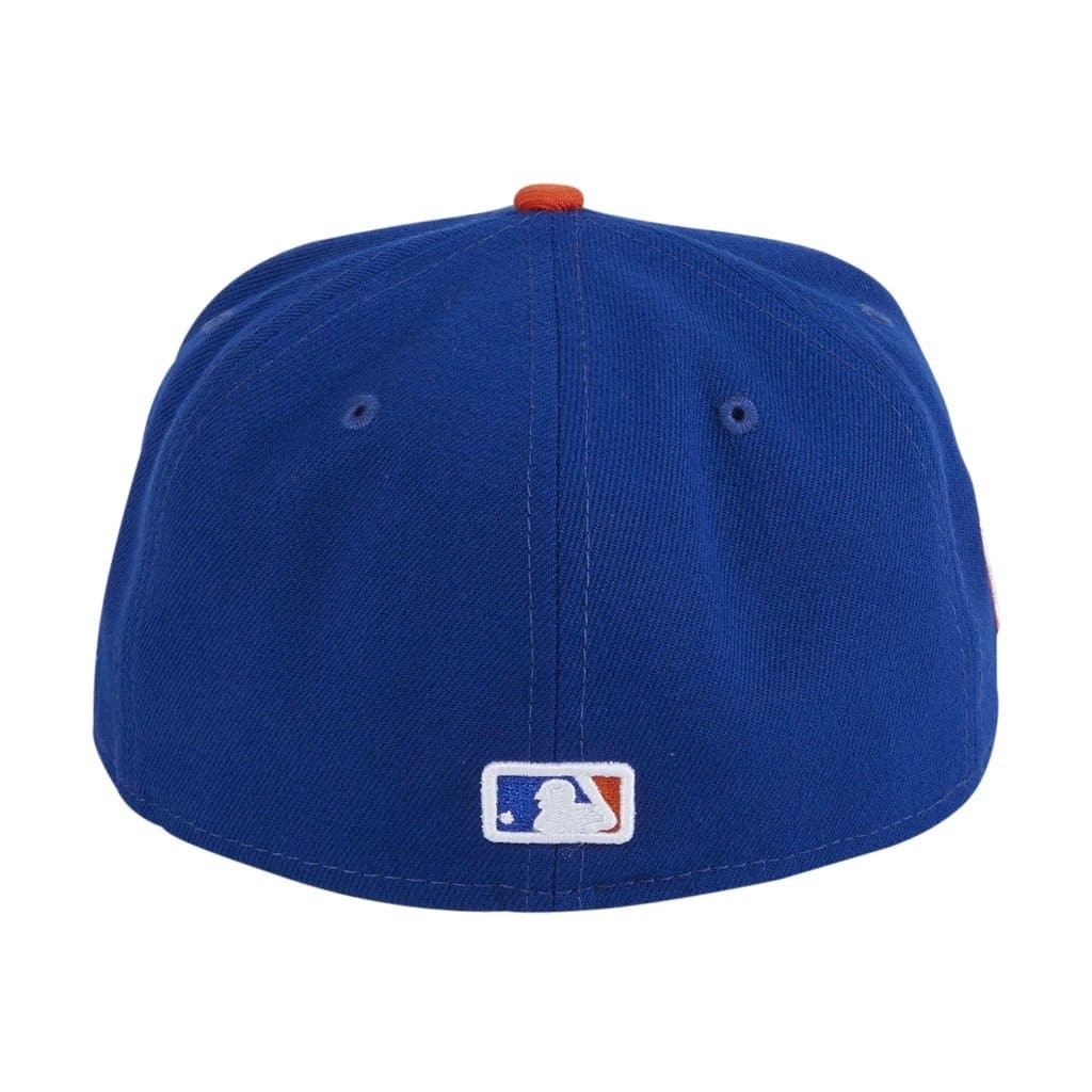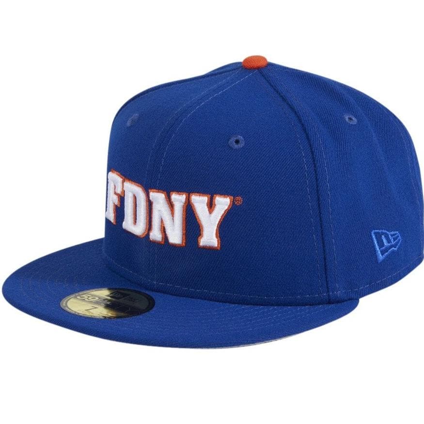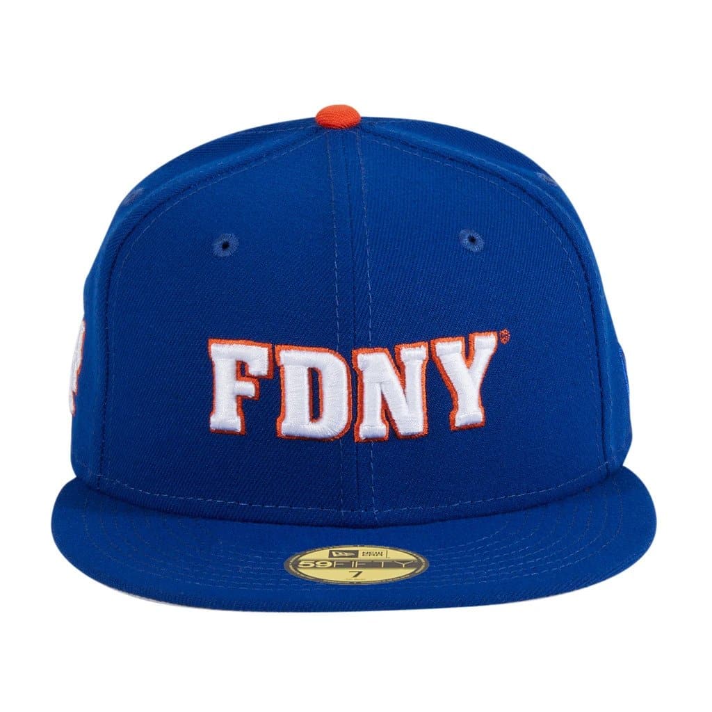 The New Era FDNY New York Mets 59FIFTY fitted hat has the team color royal blue and orange colorway. The 6 panel, structured high crown and embroidered eyelets are royal blue. The fabric squatchee button is orange. The flat bill of the FDNY fitted hat is royal blue with a grey bottom undervisor. The front features "FDNY" (an acronym for Fire Department of New York) lettermark embroidered in white thread with an orange outline thread. The right panel of the fitted has the New York Mets logo embroidered on the side and the left panel the New Era "Fly Your Own Flag" logo.