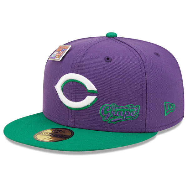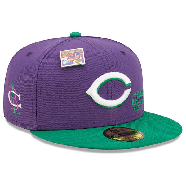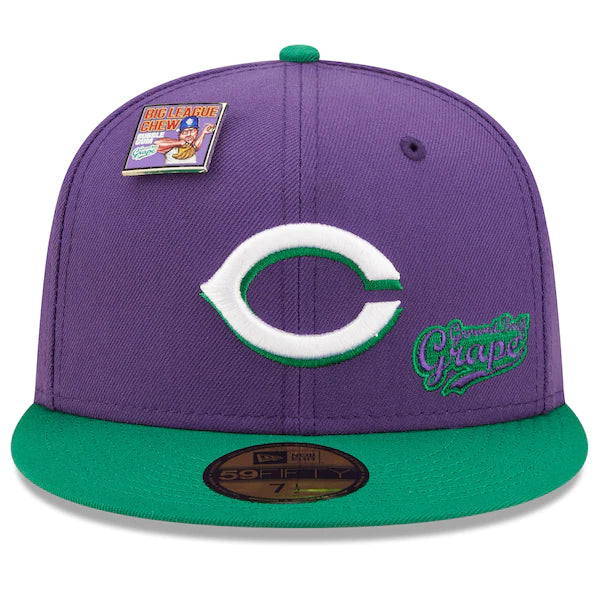 The MLB and Big League Chew have teamed up to bring Cincinnati Reds fans this one of a kind, Ground Ball Grape Flavor Pack 59FIFTY Fitted Hat. Featuring a high crown and flat bill, this New Era hat will take your game day look to the next level. Its classic and fun graphics combine your Cincinnati Reds and your all-time favorite Big League Chew flavor, making it unlike anything else in your collection.