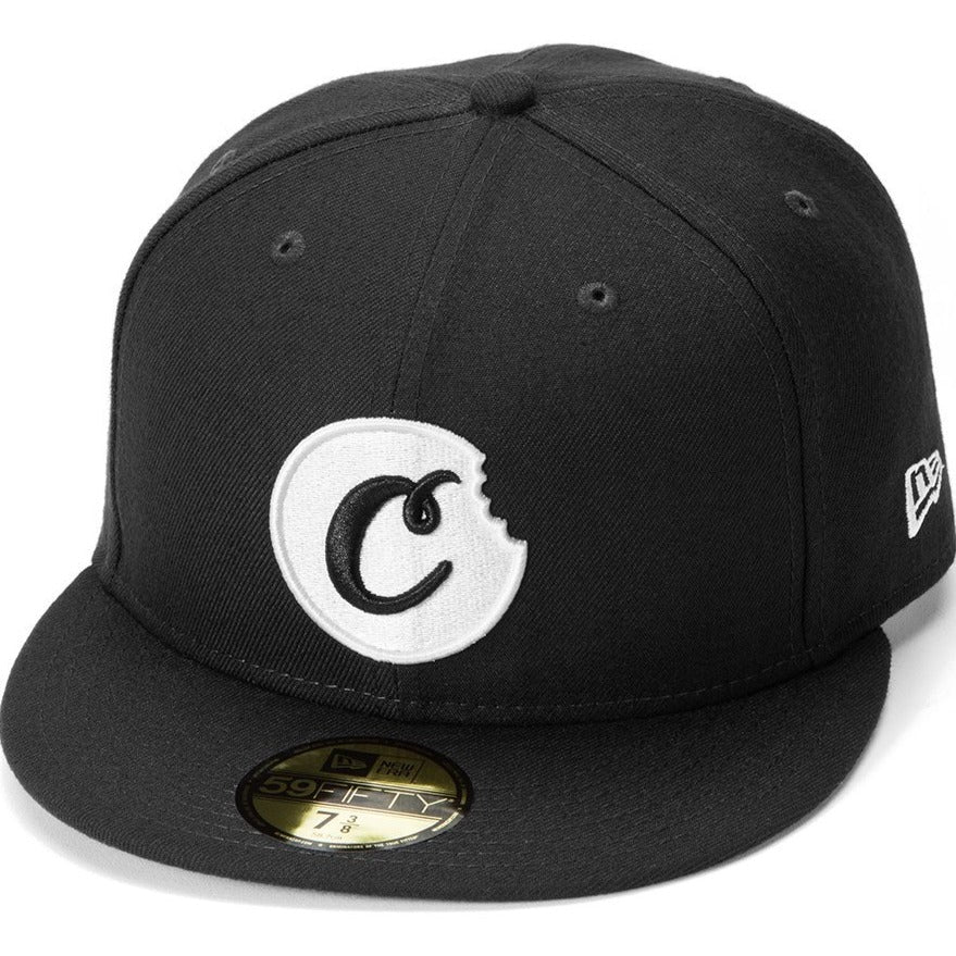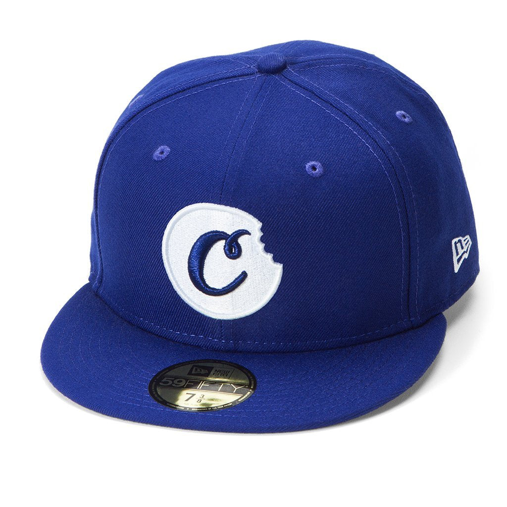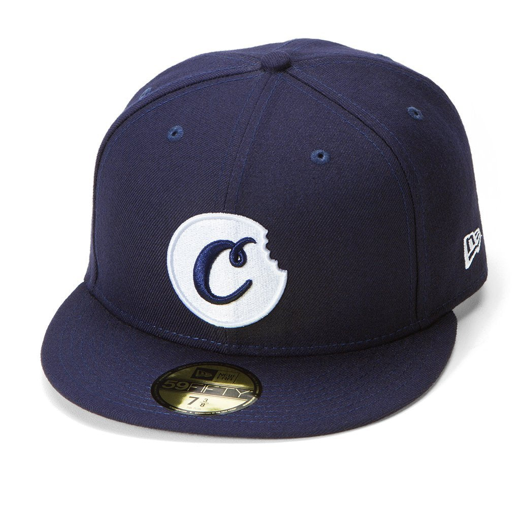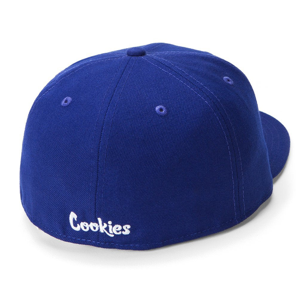 The New Era Cookies Fitted Hat comes in a variety of different colorways including black & white, scarlet red & white, navy blue & white and royal blue & white. The structured six panel high crown, embroidered eyelets and fabric squatchee button are all a solid color. The flat bill of the fitted is also a solid color. The front panel of the fitted cap features the