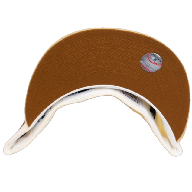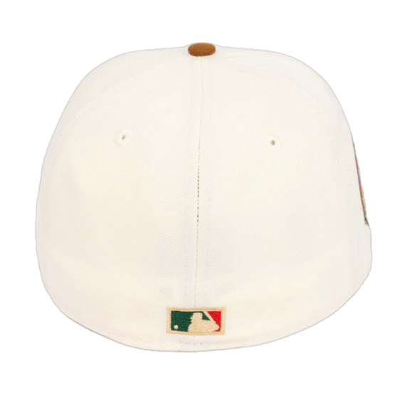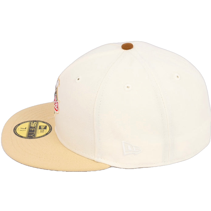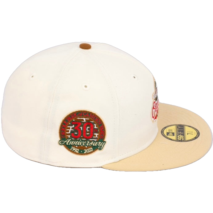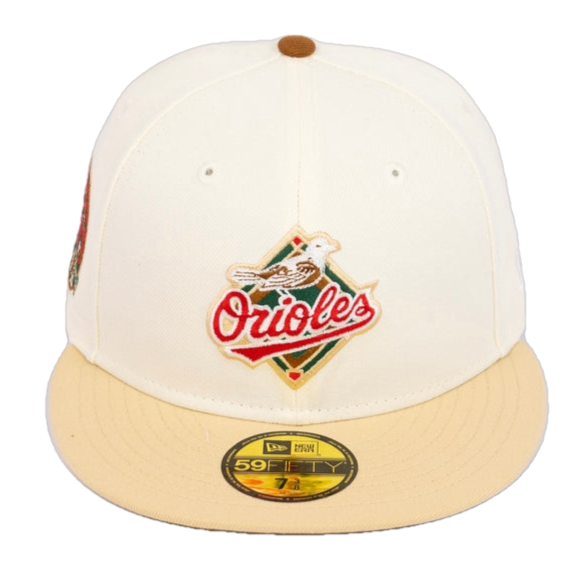 This New Era Baltimore Orioles 30th Anniversary 'Eggnog Pack' 59FIFTY Fitted Hat was released by Energie. The fitted has a chrome six panel structured high crown and embroidered eyelets with a toasted peanut fabric squatchee button. The fitted also has a vegas gold flat visor with a toasted peanut undervisor and white sweatband. The front panel features the Baltimore Orioles logo embroidered in toasted peanut, red and green stitching. The left panel of the fitted displays the New Era logo and the official MLB logo embroidery on the rear crown.