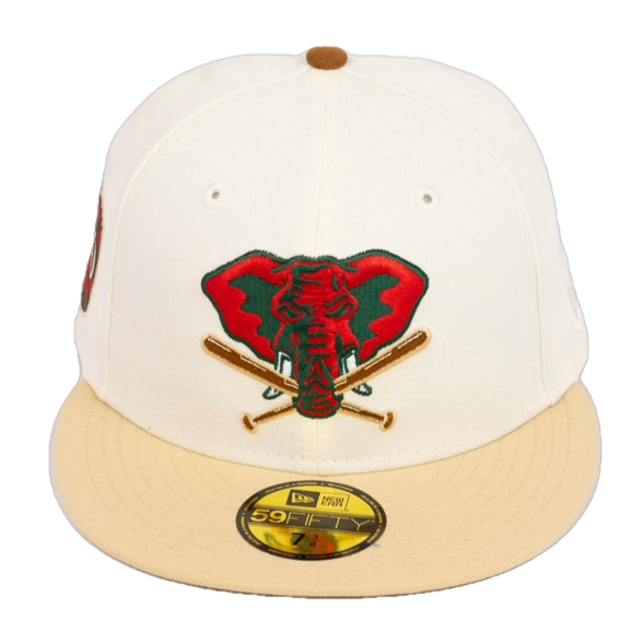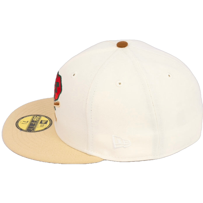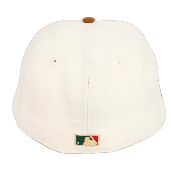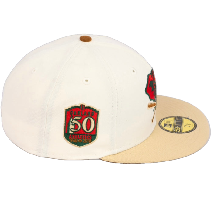 This New Era Oakland Athletics 50th Anniversary 'Eggnog Pack' 59FIFTY Fitted Hat was released by Energie. The fitted has a chrome six panel structured high crown and embroidered eyelets with a toasted peanut fabric squatchee button. The fitted also has a vegas gold flat visor with a toasted peanut undervisor and white sweatband. The front panel features the Oakland Athletics logo embroidered in toasted peanut, red and green stitching. The left panel of the fitted displays the New Era logo and the official MLB logo embroidery on the rear crown.
