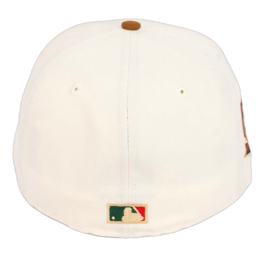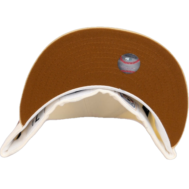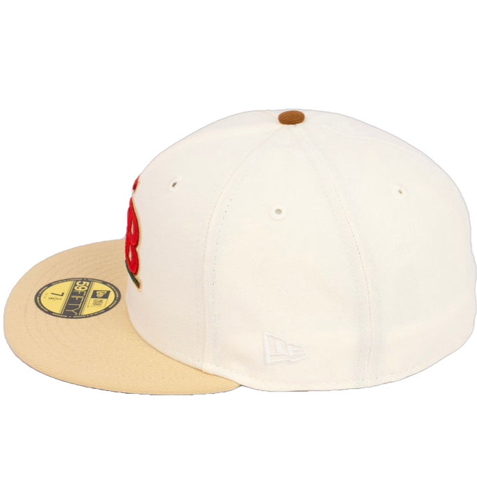 This New Era Tampa Bay Ray 20th Anniversary 'Eggnog Pack' 59FIFTY Fitted Hat was released by Energie. The fitted has a chrome six panel structured high crown and embroidered eyelets with a toasted peanut fabric squatchee button. The fitted also has a vegas gold flat visor with a toasted peanut undervisor and white sweatband. The front panel features the Tampa Bay Rays logo embroidered in toasted peanut, red and green stitching. The left panel of the fitted displays the New Era logo and the official MLB logo embroidery on the rear crown.