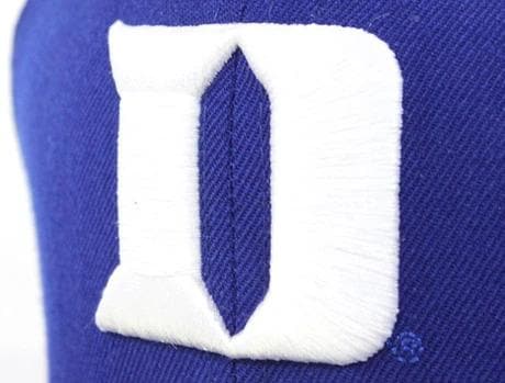 Duke University fitted hat features a royal blue 6 panel, structured high crown, embroidered eyelets and fabric squatchee button. The flat bill of the Duke fitted hat is also royal blue with a grey bottom undervisor and a New Era gold & black 59FIFTY official sticker. The front panel features the "D" lettermark ( D for Duke) embroidered in white thread. The left panel features the New Era "Fly Your Own Flag" logo in royal blue thread. This Duke fitted hat is great for students attending the top prestigious university or prospective