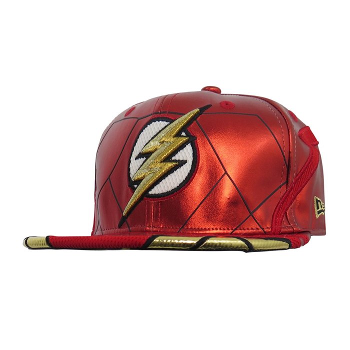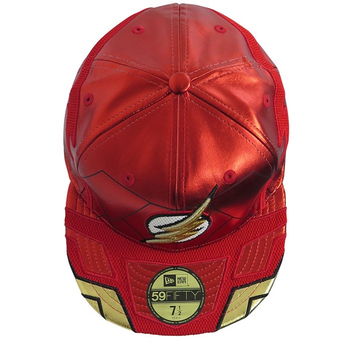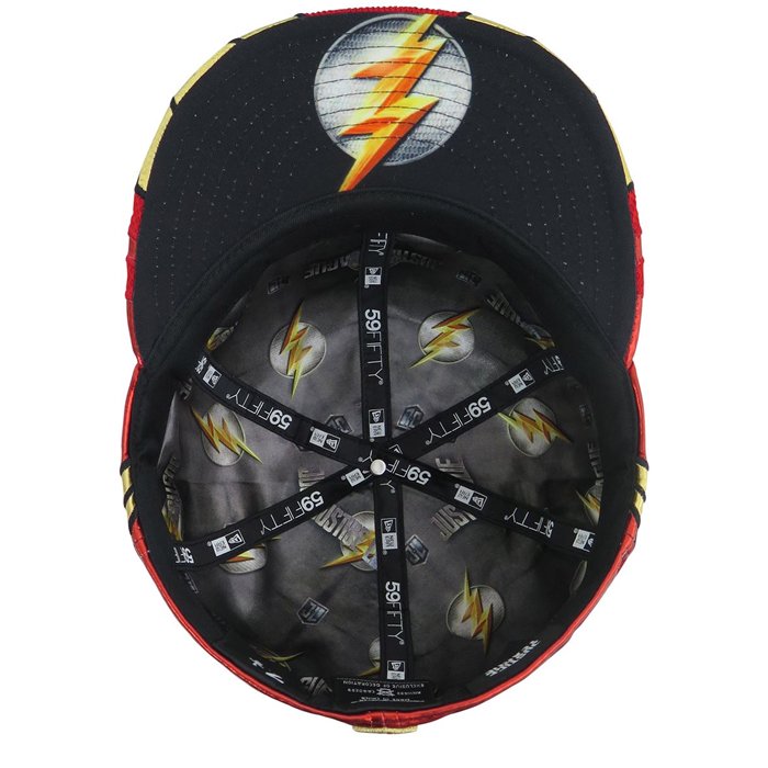 Details: Yes, you can attain unheard of velocities, but can your body take the strain? As the Flash, you're enveloped by a subtle Speed Force cocoon to protect against the rigors of post-light speeds. Unfortunately, you're combating hive-minded insect soldiers and planet-decimating space-gods -- you're going to need the extra protection provided by a sturdy suit, and our Flash Justice League Armor 59Fifty Fitted Hat. Made from a reflective 100% polyester, this EXCLUSIVE and EXTREMELY LIMITED Flash hat features a smooth, vinyl-like body adorned with a raised, embroidered Flash symbol overlaying costume-accurate accents. The bill? It's red, flat, layered in a resilient diamond-shaped stitching mimicking hard-fiber mesh, and accented by reflective, simulating plating. Under the bill? The very Flash symbol adorning Flash's durable super-suit in the hit film, Justice League. The sides? Two embroidered, gold-foil-filled wing-bits simulating Flash's updated earpieces. Hey! What's on the back?? An embroidered "JL," the official Justice League movie shield. The inner lining? A phasing black material layered with several Flash symbols and Justice League logos. The official New Era sticker? It's right there, resting soundly on top of the red bill.