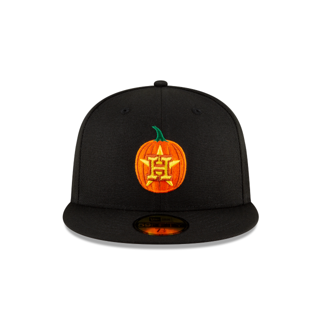 The Houston Astros Carved Pumpkins 59FIFTY Fitted Hat features an embroidered Braves logo "carved" into a pumpkin at the front panels with an orange under visor and an MLB Batterman embroidered at the rear.