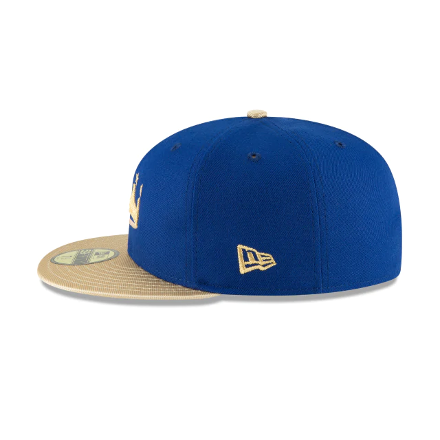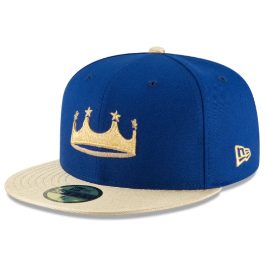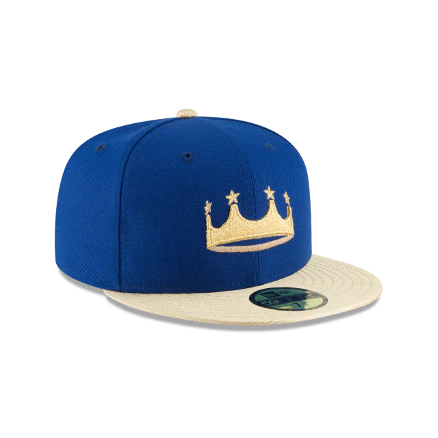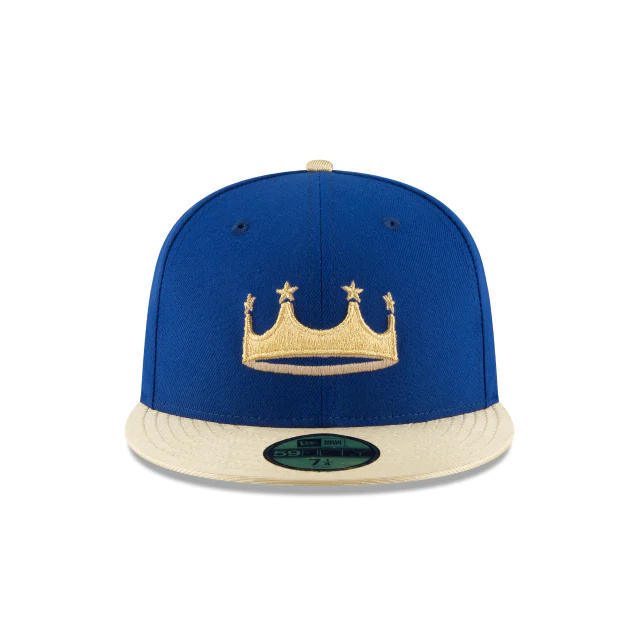 The Kansas City Royals Turn Ahead The Clock 59FIFTY Fitted Cap features a gold Royals crown logo embroidered at the front panels with gold colored accents including the visor, top button and New Era flag at the left-wear side.