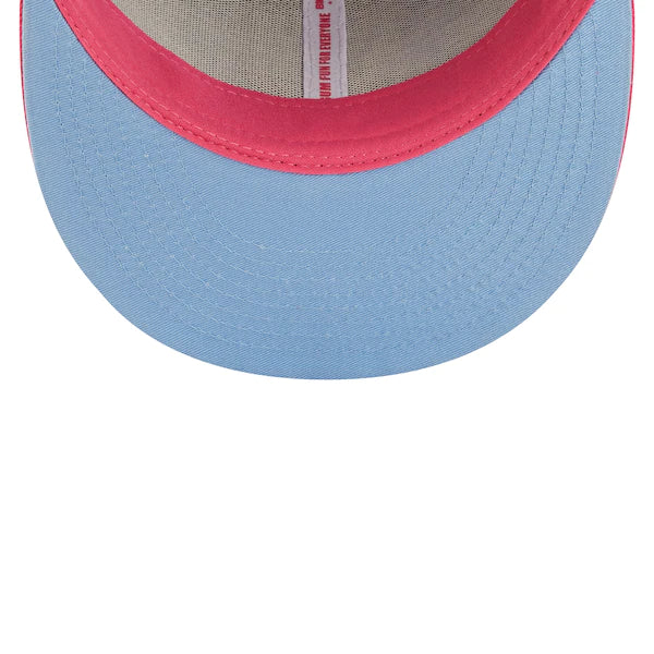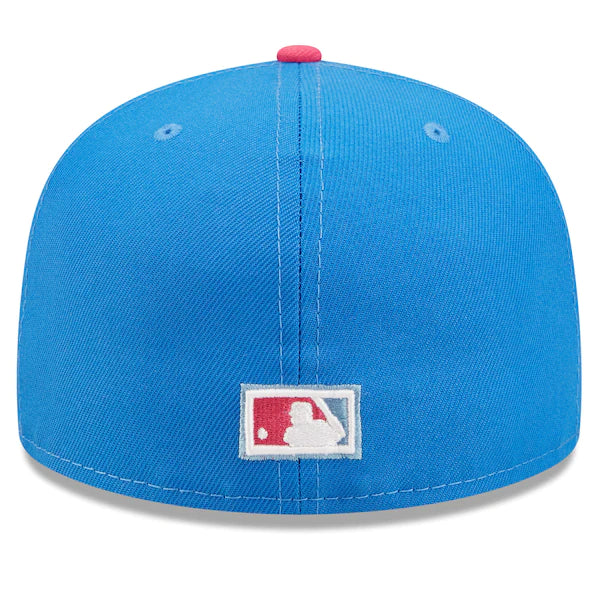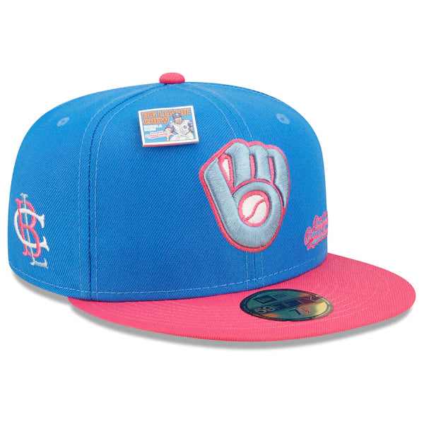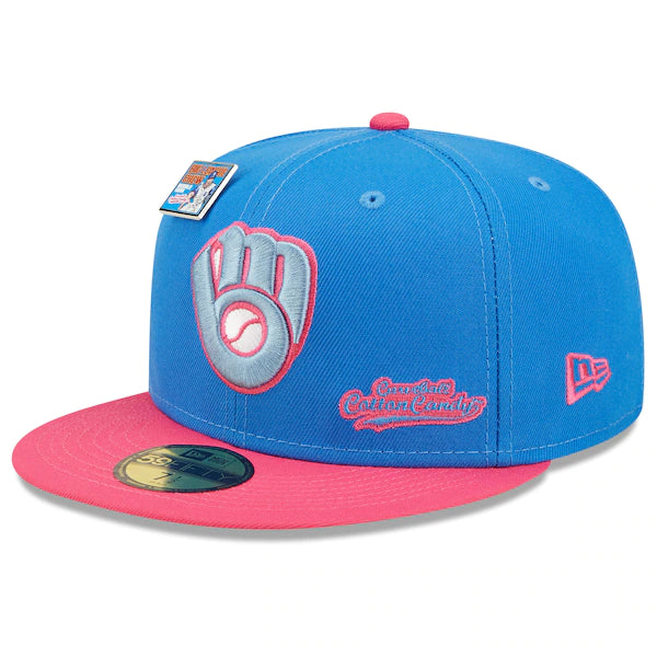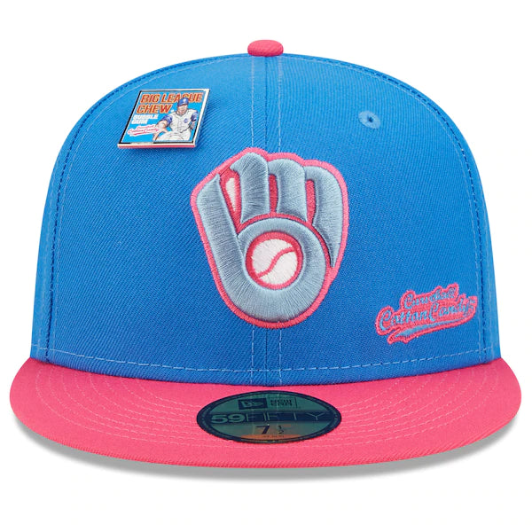 The MLB and Big League Chew have teamed up to bring Milwaukee Brewers fans this one of a kind, Curveball Cotton Candy Flavor Pack 59FIFTY Fitted Hat. Featuring a high crown and flat bill, this New Era hat will take your game day look to the next level. Its classic and fun graphics combine your Milwaukee Brewers and your all-time favorite Big League Chew flavor, making it unlike anything else in your collection.