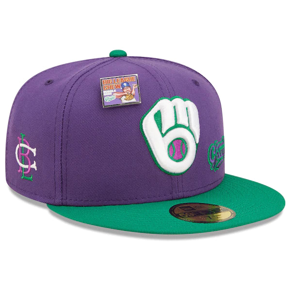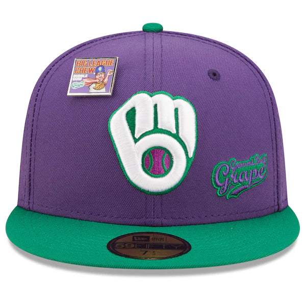 The MLB and Big League Chew have teamed up to bring Milwaukee Brewers fans this one of a kind, Ground Ball Grape Flavor Pack 59FIFTY Fitted Hat. Featuring a high crown and flat bill, this New Era hat will take your game day look to the next level. Its classic and fun graphics combine your Milwaukee Brewers and your all-time favorite Big League Chew flavor, making it unlike anything else in your collection.