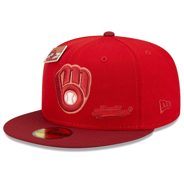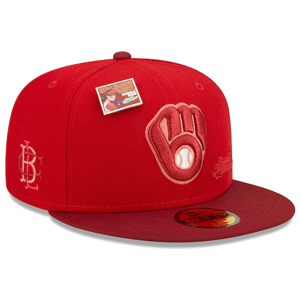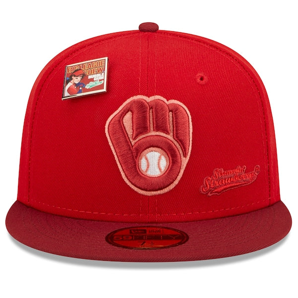 The MLB and Big League Chew have teamed up to bring Milwaukee Brewers fans this one of a kind, Slammin' Strawberry Flavor Pack 59FIFTY Fitted Hat. Featuring a high crown and flat bill, this New Era hat will take your game day look to the next level. Its classic and fun graphics combine your Milwaukee Brewers and your all-time favorite Big League Chew flavor, making it unlike anything else in your collection.