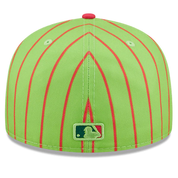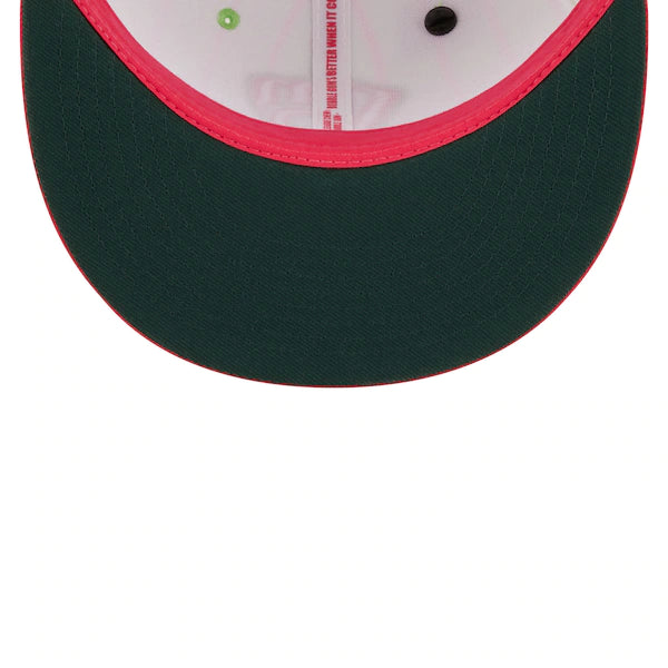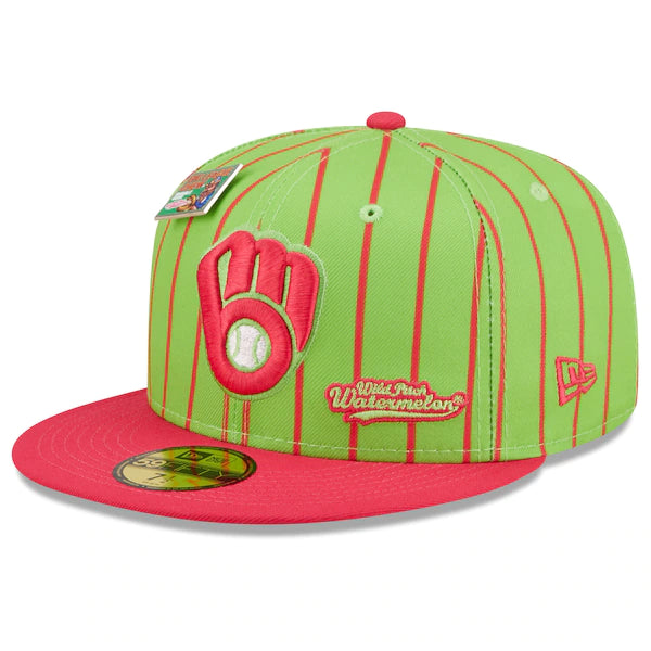 The MLB and Big League Chew have teamed up to bring Milwaukee Brewers fans this one of a kind, Wild Pitch Watermelon Flavor Pack 59FIFTY Fitted Hat. Featuring a high crown and flat bill, this New Era hat will take your game day look to the next level. Its classic and fun graphics combine your Milwaukee Brewers and your all-time favorite Big League Chew flavor, making it unlike anything else in your collection.
