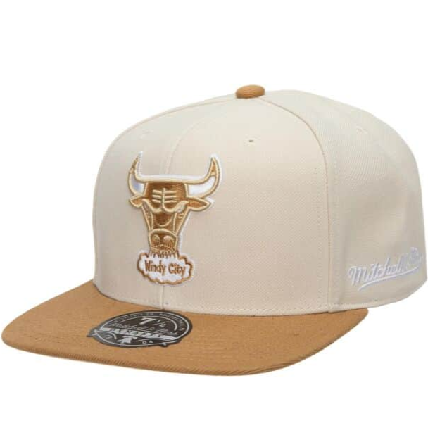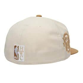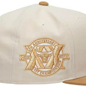This Mitchell & Ness Chicago Bulls Sandman Hardwood Classics fitted hat has a cream six panel structured high crown and embroidered eyelets with a light brown fabric squatchee button. The visor of the fitted is also light brown with a cream undervisor. The front panel features the NBA team logo embroidery and an additional side patch embroidery on the right panel.