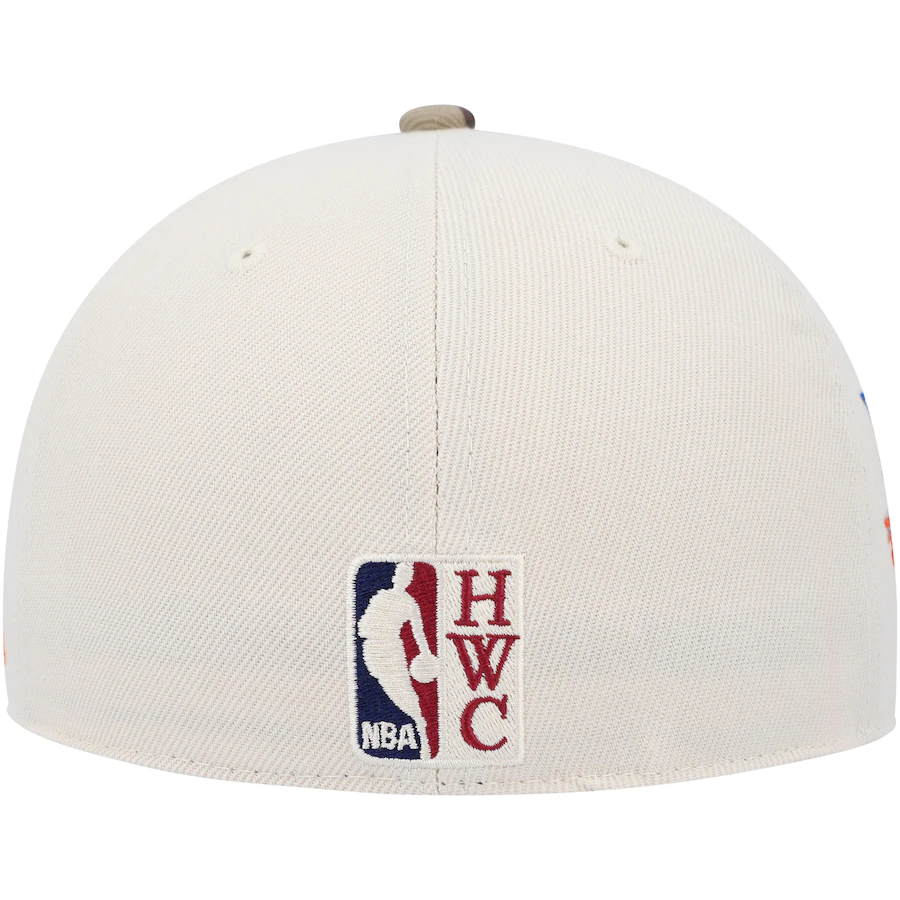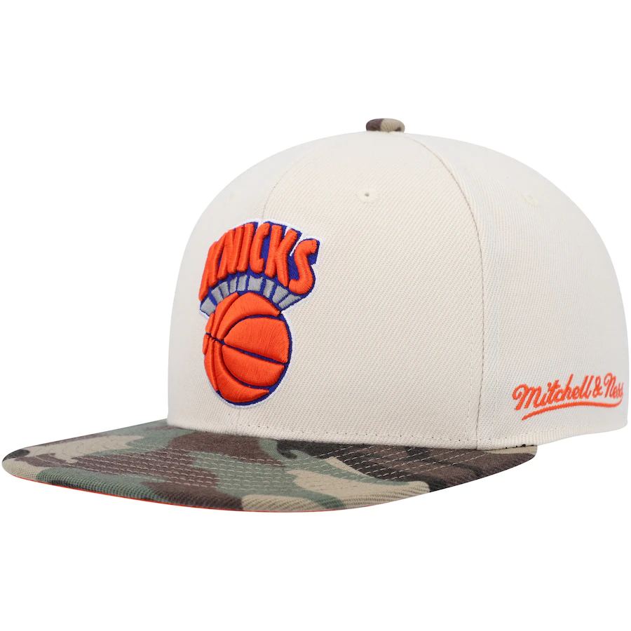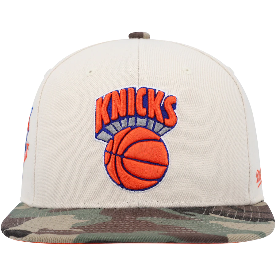 Show your unwavering support for the New York Knicks by sporting this Hardwood Classics 50th Anniversary Off White fitted hat from Mitchell & Ness. It features embroidered graphics and a side patch honoring team history. The sublimated camo pattern and contrast-color undervisor combine to make this unique cap the perfect option to represent the New York Knicks.
