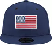 This New Era American flag 59FIFTY fitted hat has a navy blue six panel structured high crown, embroidered eyelets and flat bill. The front panel features the American flag embroidered in red, white and blue stitching.