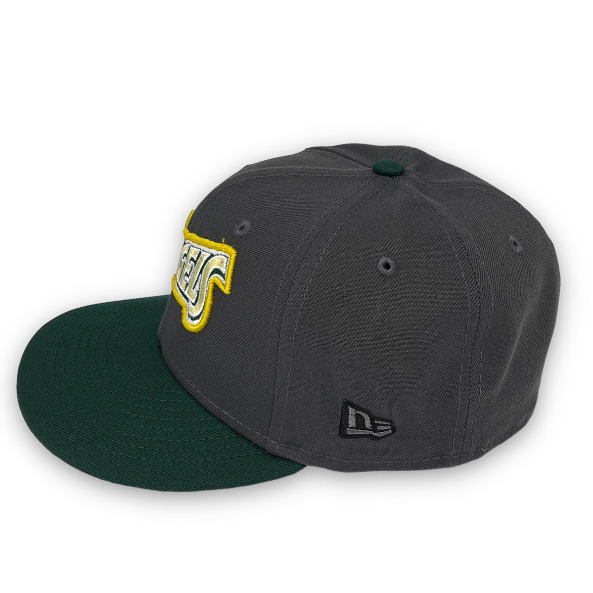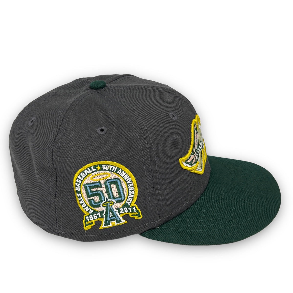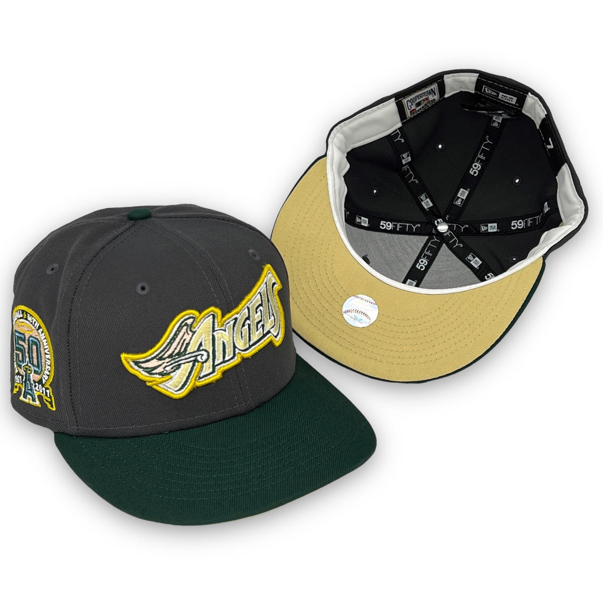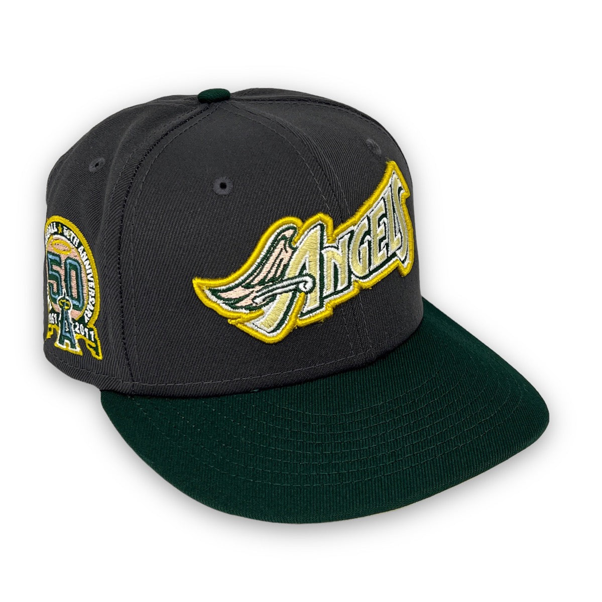 This New Era Anaheim Angels "Calligraphy Pack" 59FIFTY Fitted Hat was released by USA Cap King. The fitted has a six panel structured high crown and embroidered eyelets with a fabric squatchee button and flat bill. The front panel features the Anaheim Angels logo embroidery and a side patch on the right-wear side. The left panel of the fitted displays the New Era logo and the official MLB logo embroidery on the rear crown.