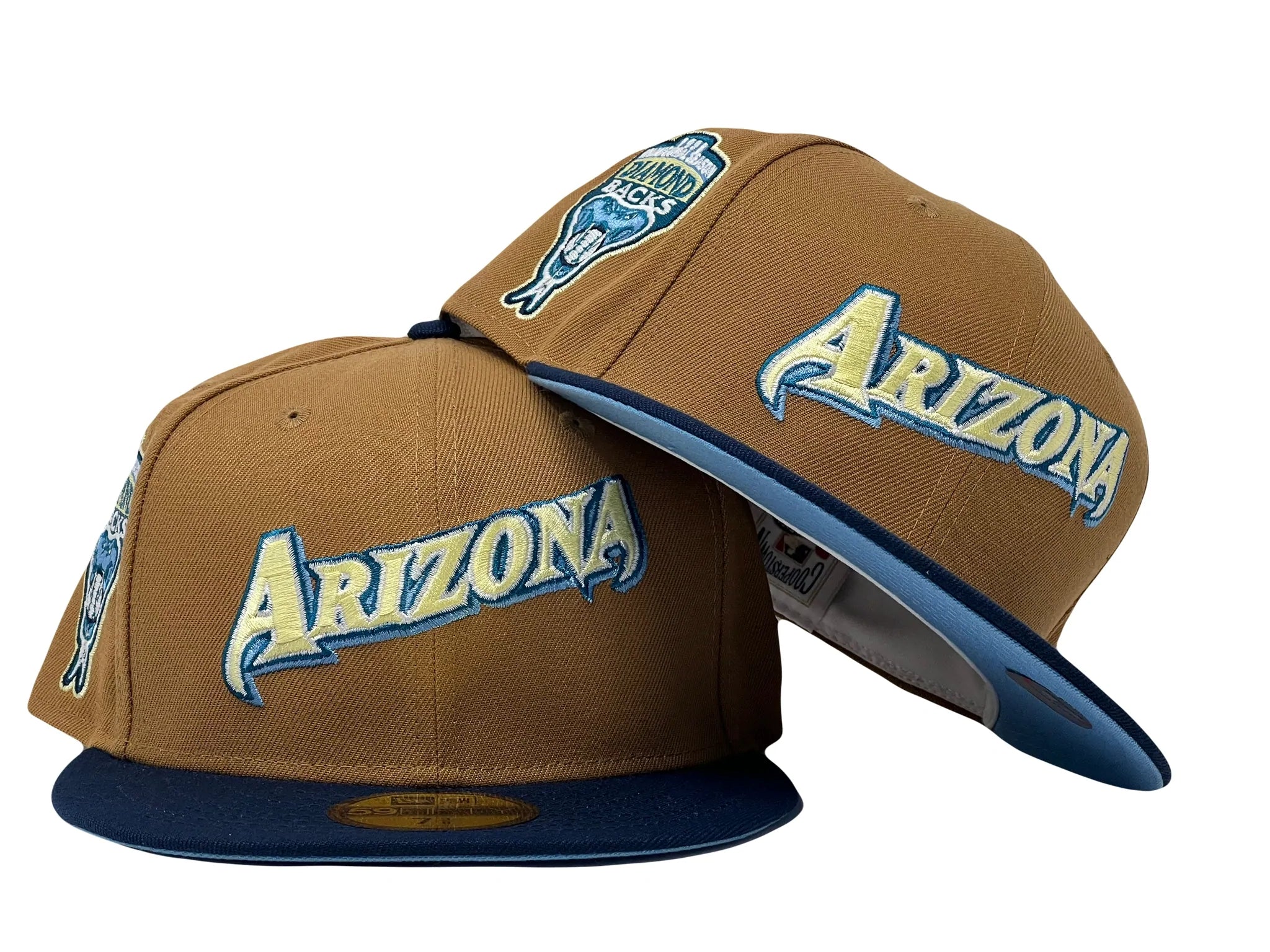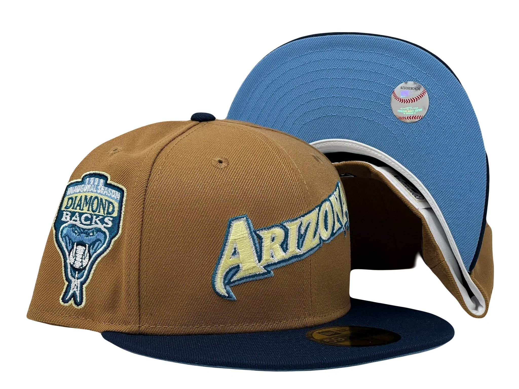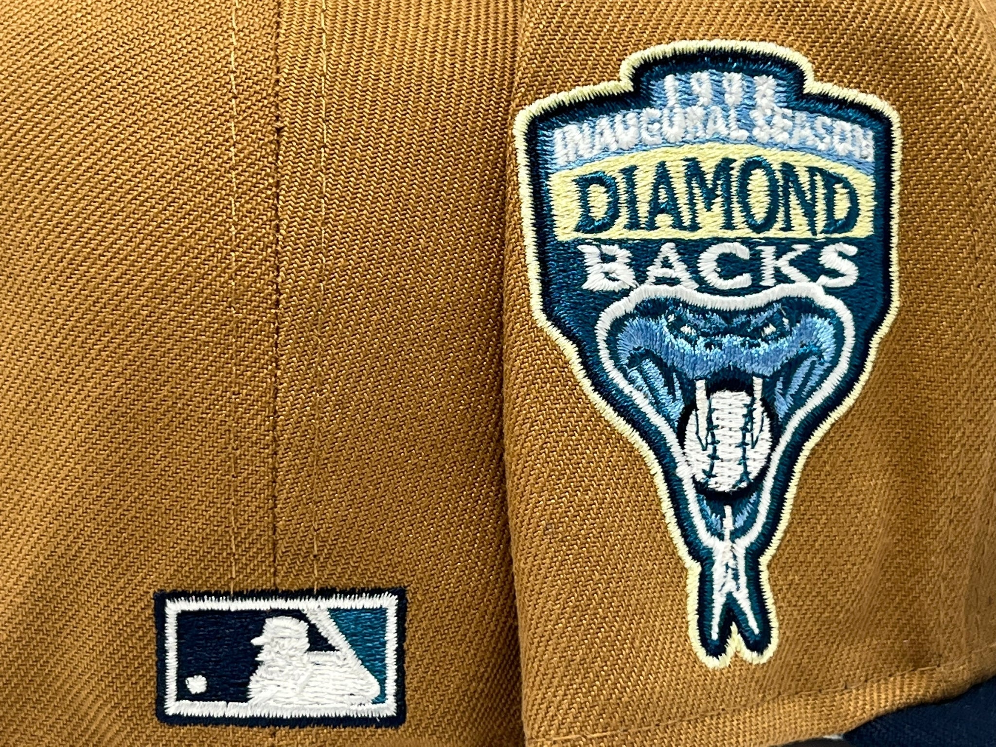 This New Era Arizona Diamondbacks 1998 Inaugural Season Light Bronze/Navy 2023 59FIFTY Fitted Hat was released by Sports World 165. The fitted has a light bronze six panel structured high crown and embroidered eyelets with a navy blue fabric squatchee button and flat bill. The fitted cap has a light blue undervisor with a white sweatband. The front panel features the Arizona Diamondbacks logo embroidery and a side patch embroidered on the right panel. The left panel of the fitted displays the New Era logo and the official MLB logo embroidery on the rear crown.
