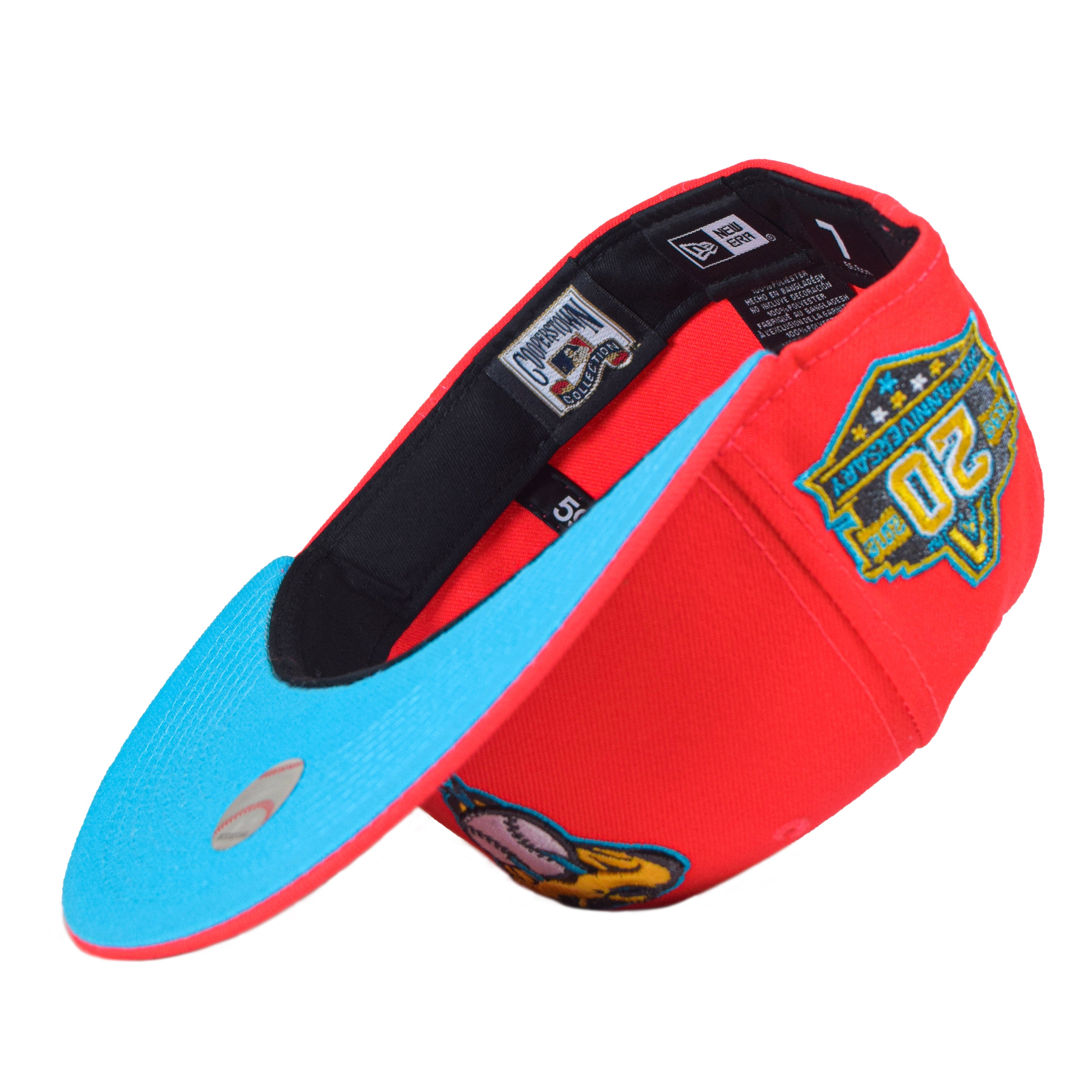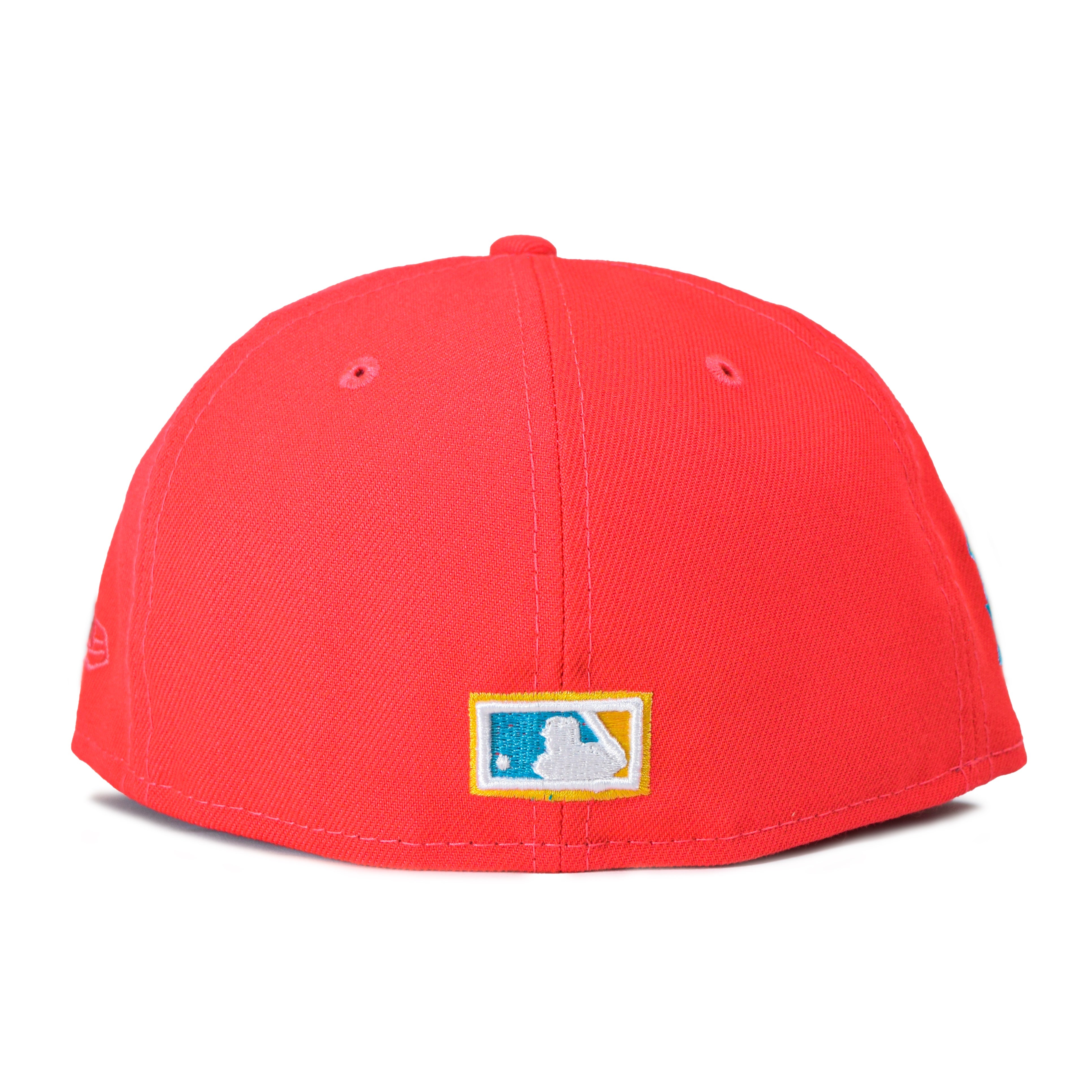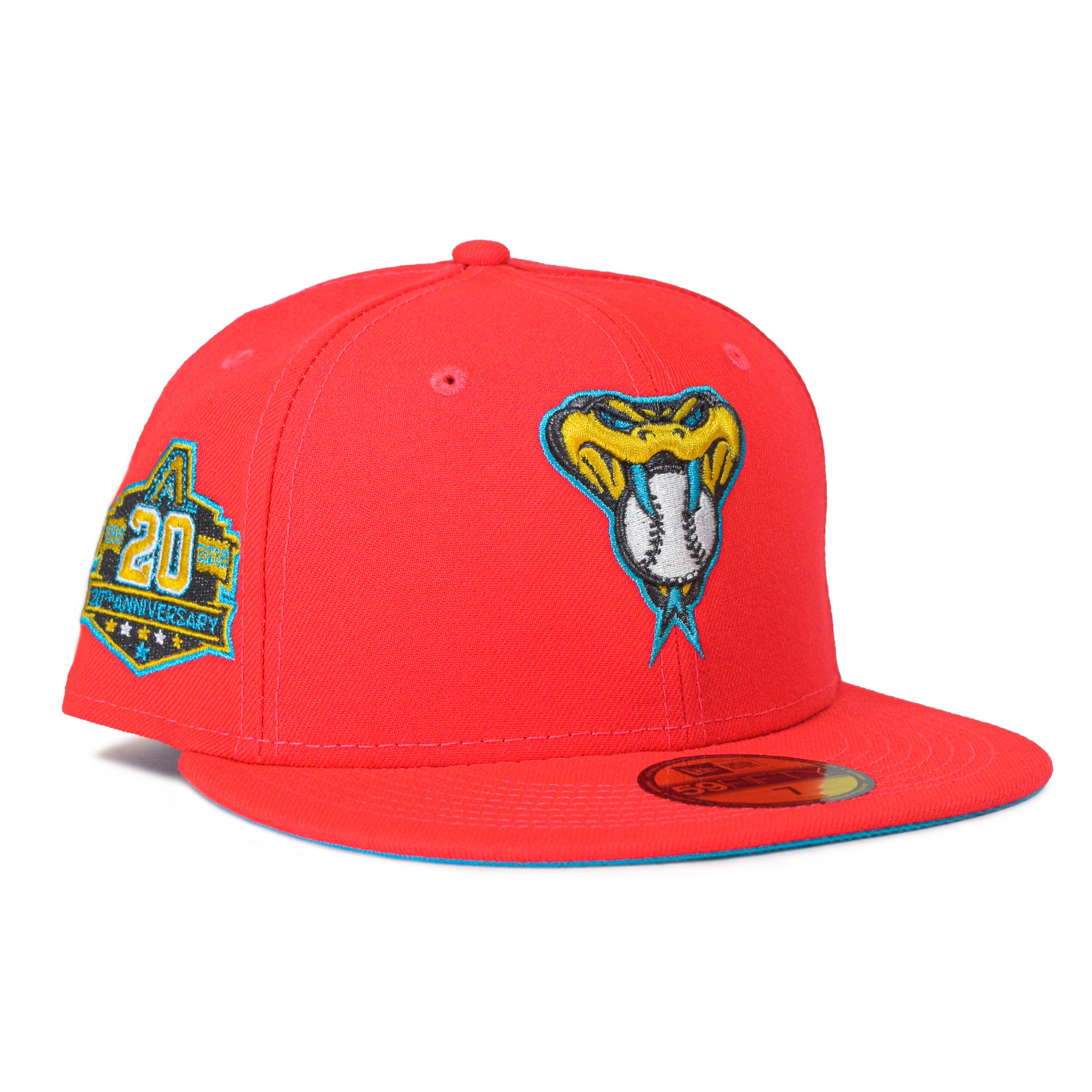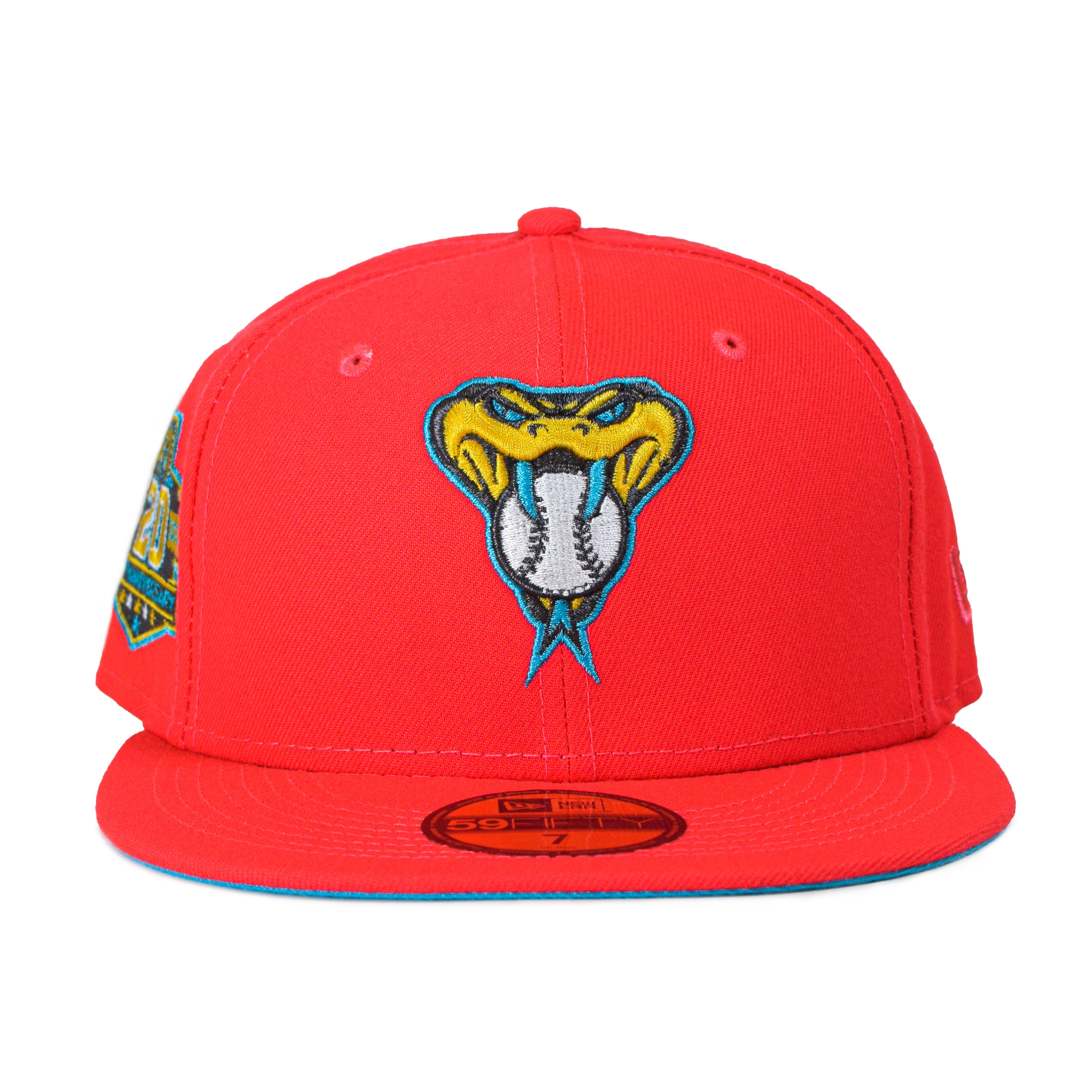 This New Era Arizona Diamondbacks 'Heat Wave 59FIFTY fitted hat has a lava red six panel structured high crown, embroidered eyelets and fabric squatchee button. The fitted cap also has a lava red flat bill with a teal undervisor and black sweatband. The front panel features the Arizona Diamondbacks logo embroidered in orange and teal threads with a side patch embroidery on the right panel. The left panel of the fitted displays the New Era logo with the official MLB logo embroidery on the rear crown.