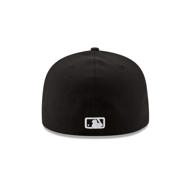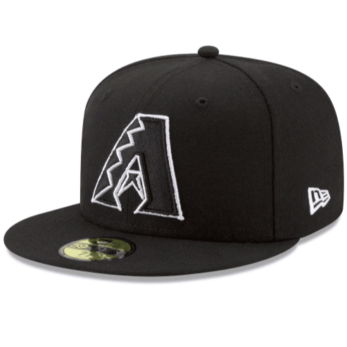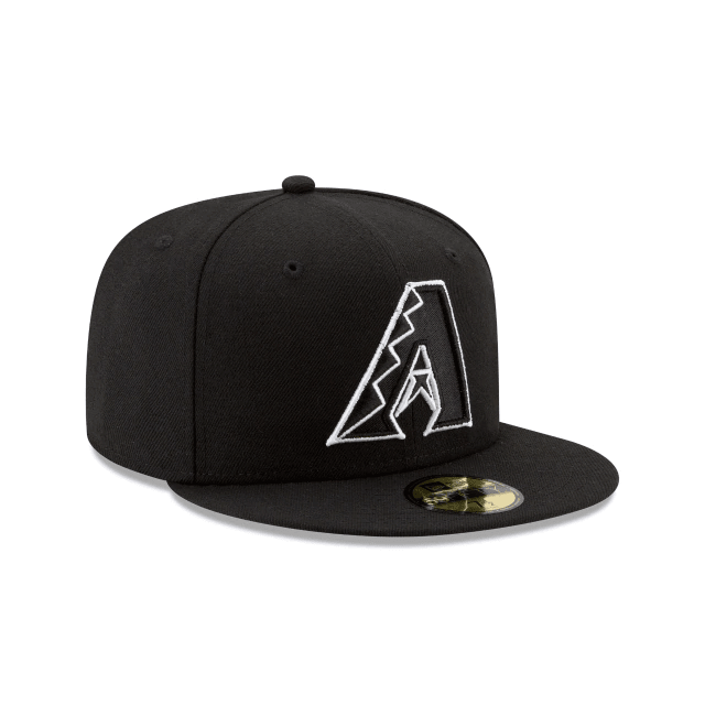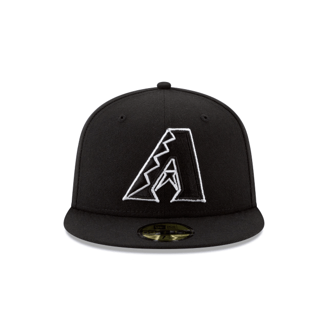 The Arizona Diamondbacks Black and White is a 59FIFTY® with a black polyester crown and visor offset with the team logo in white embroidery on the front panels.