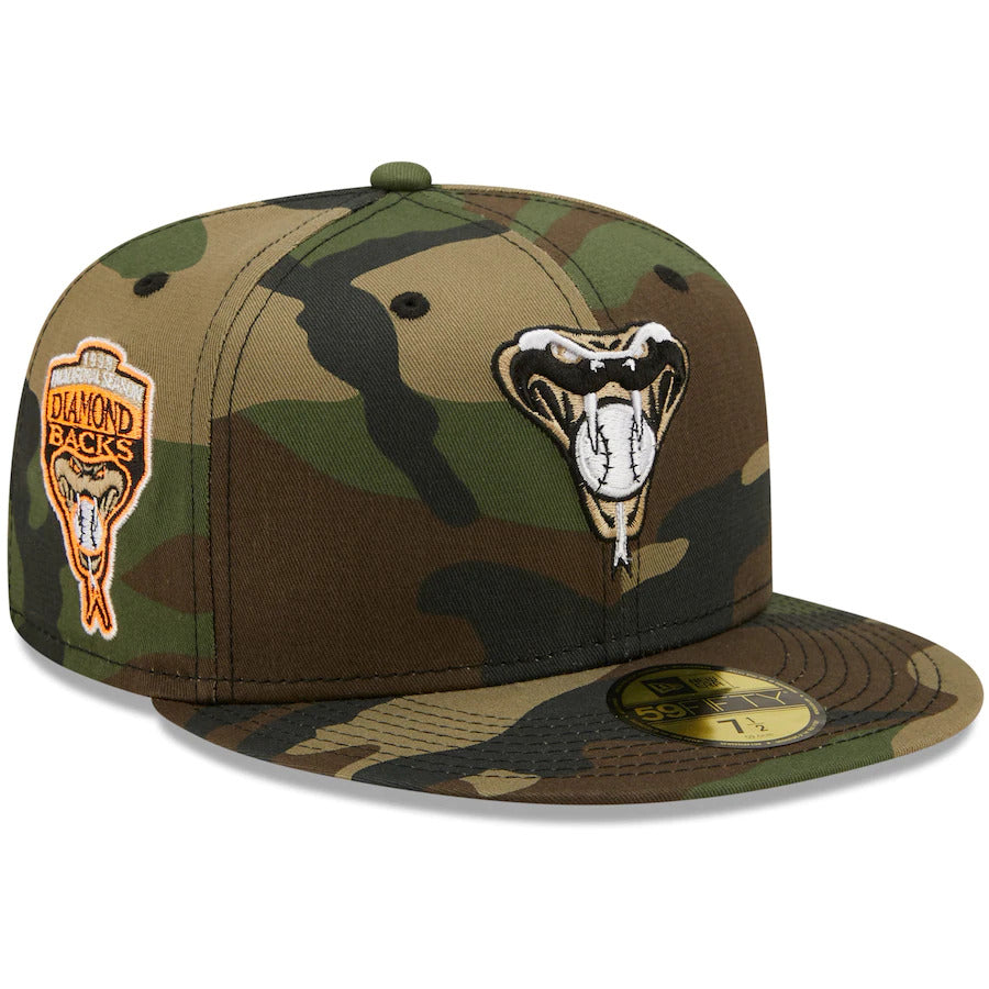 Be bold and use camouflage to draw attention to your Arizona Diamondbacks pride with this 1998 Inaugural Season Flame Undervisor 59FIFTY hat. This New Era hat is decked out in rich embroidery dedicated to a memorable Arizona Diamondbacks moment, which contrasts brilliantly against the camo crown. Arizona Diamondbacks pride is hard to miss when in this fitted cap.