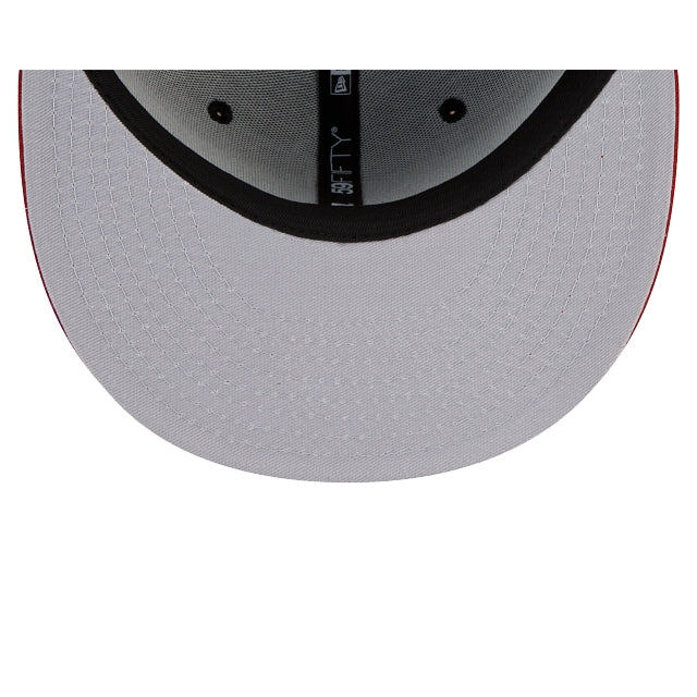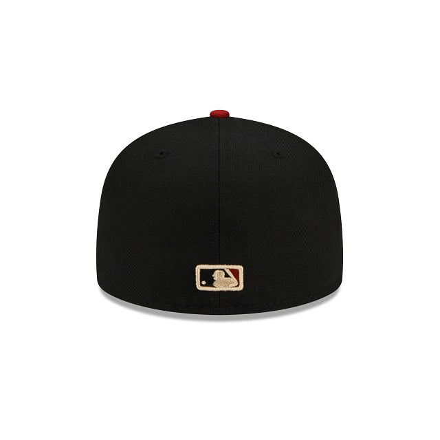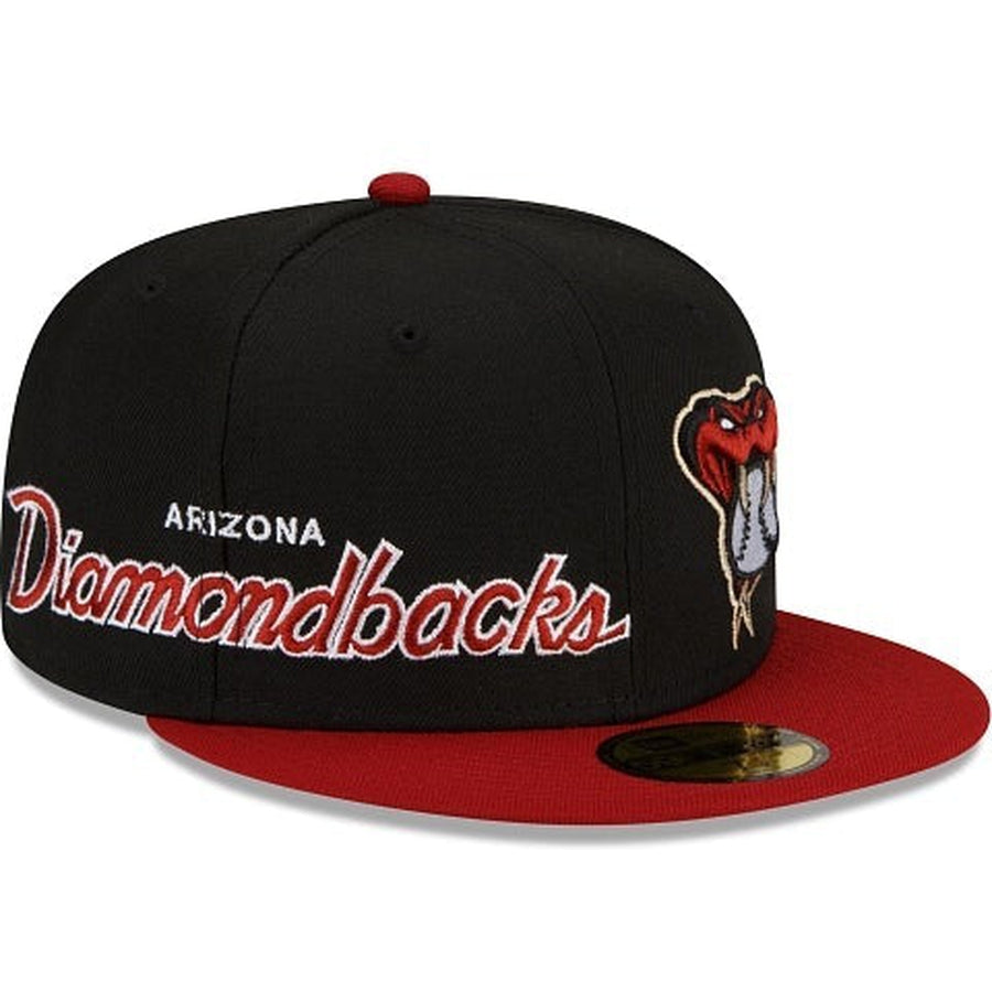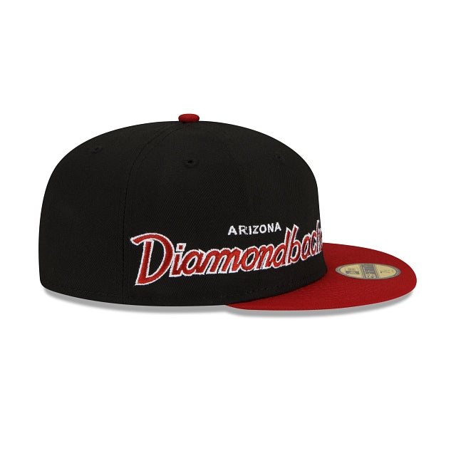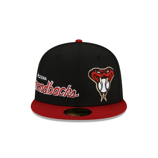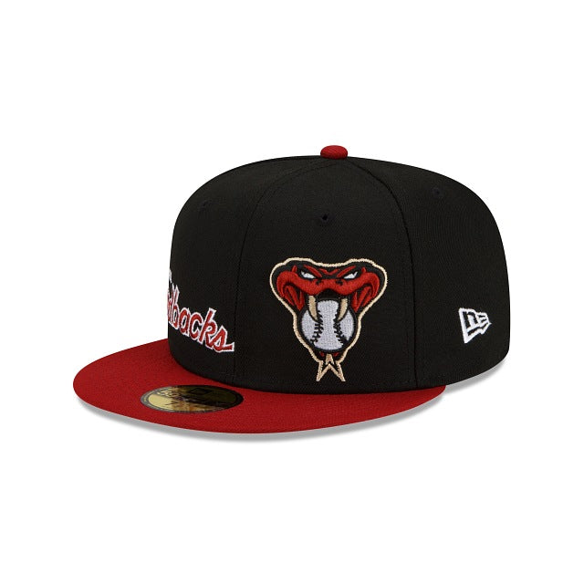 The Arizona Diamondbacks Double Logo 59FIFTY Fitted Cap features a two tone team fabrication with an embroidered Diamondbacks logo at the front left-wear panel, complimented by a team script at the right-wear side and a matching MLB Batterman logo at the rear.
