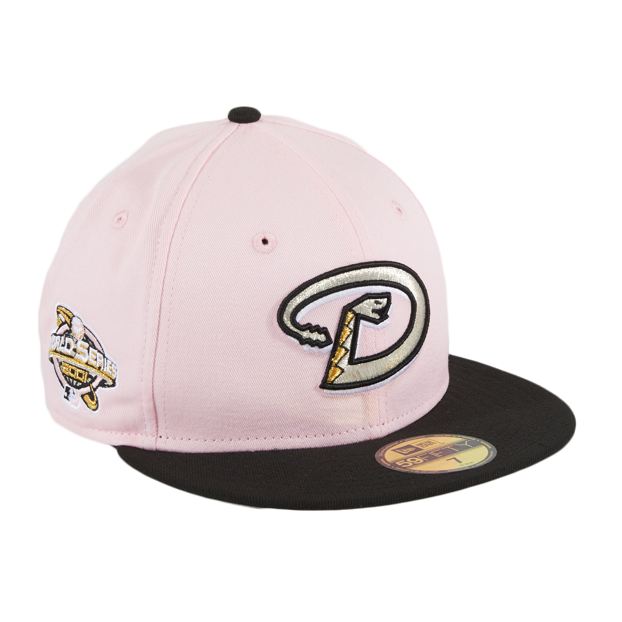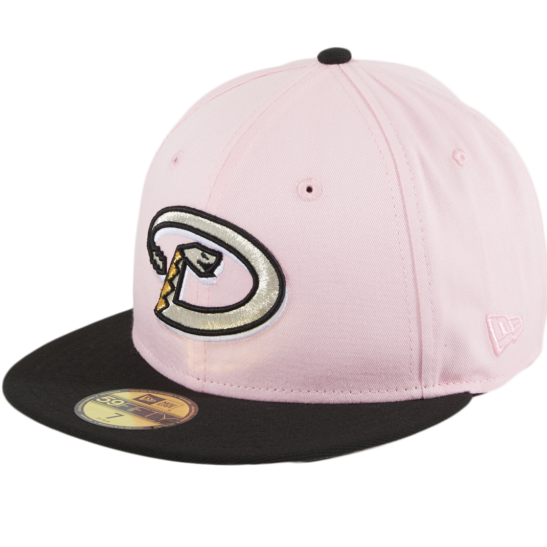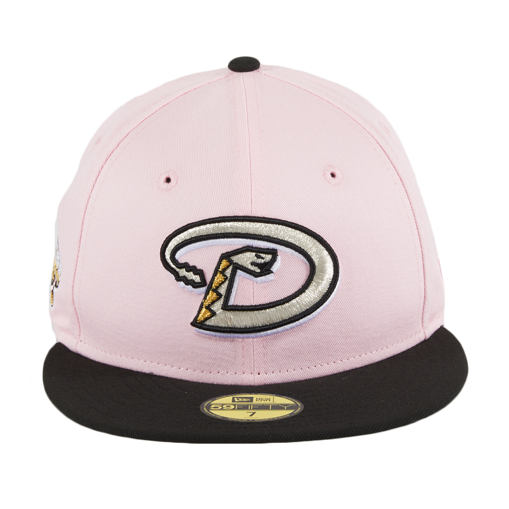The New Era Arizona Diamondbacks Heartthrob fitted hat is a Hat Club exclusive drop with a pink, black, grey and gold colorway. The fitted hat features a soft pink structured crown and a black fabric squatchee button and flat bill. The undervisor is light grey. The front panel features the MLB team logo and a side patch on the right panel.