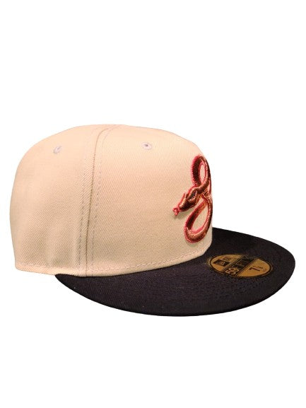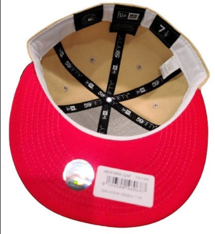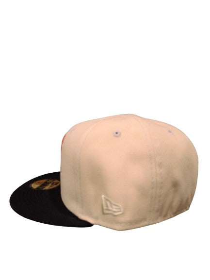 This New Era Arizona Diamondbacks 59FIFTY fitted hat has a tan six panel structured high crown, tan embroidered eyelets and a tan fabric squatchee button. The fitted cap also has a black flat bill with a red/infrared undervisor and white sweatband. The front panel features the Arizona Diamondbacks logo embroidery and a side patch embroidery on the right panel. The left panel of the fitted displays the New Era logo and the rear crown features the official MLB logo embroidery.