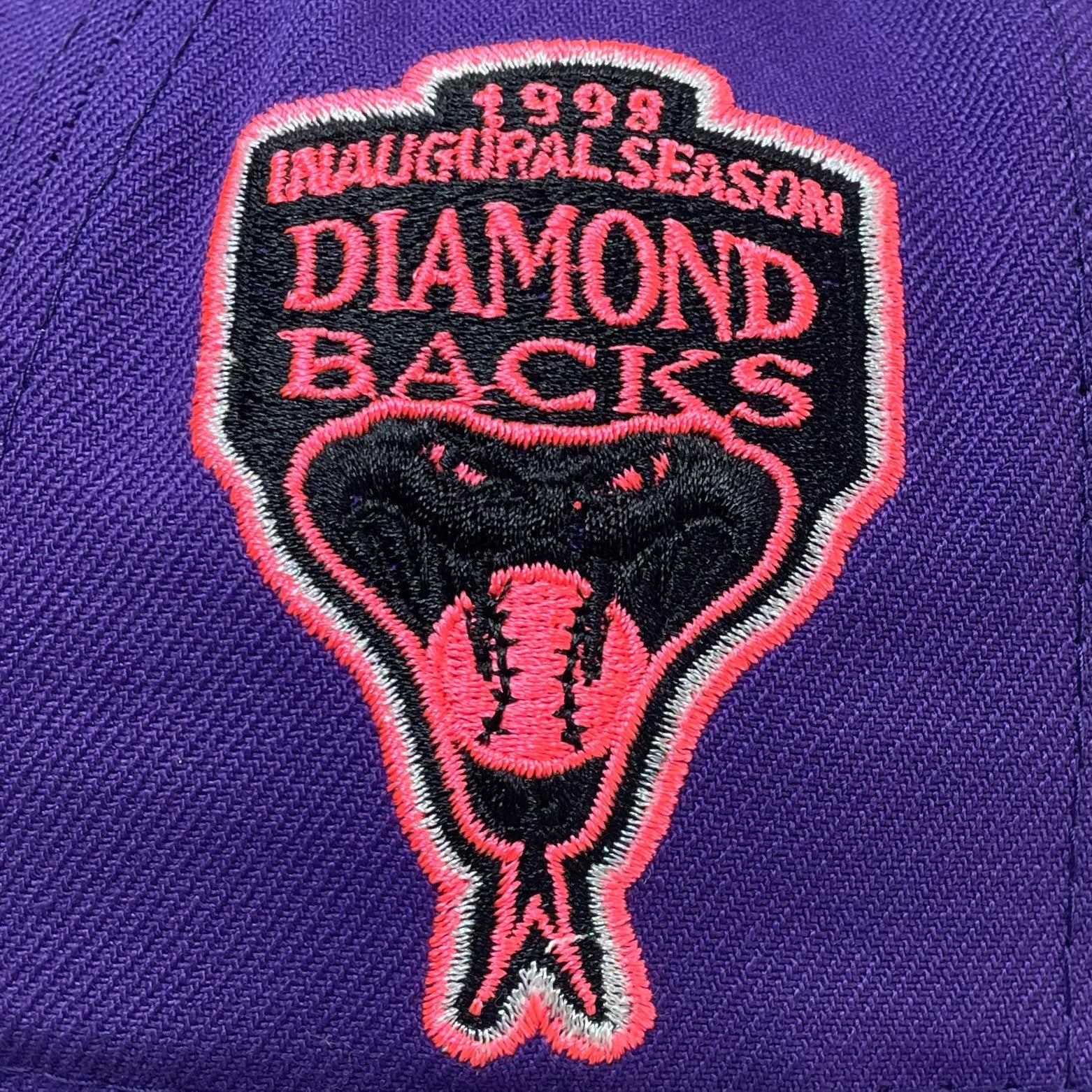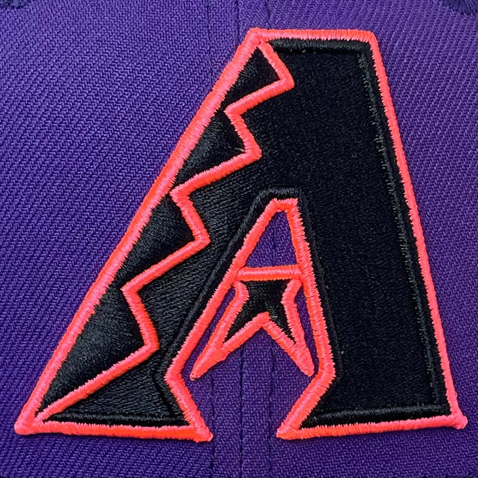 This New Era Arizona Diamondbacks Purple/Pink 1998 Inaugural Season 59FIFTY Fitted Hat has a purple six panel structured high crown and embroidered eyelets with a purple fabric squatchee button. The fitted cap has a purple flat bill with a hot pink undervisor. The front panel features the Arizona Diamondbacks logo embroidery and a 1998 Inaugural Season side patch embroidery on the right panel. The left panel of the fitted displays the New Era logo and the official MLB logo embroidery on the rear crown.