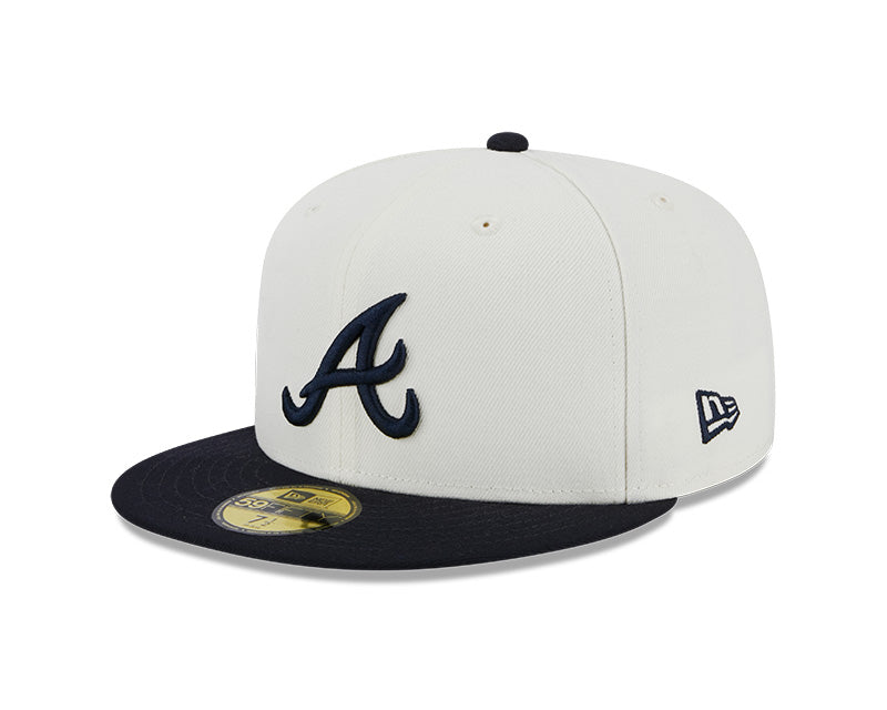 This Atlanta Braves fitted hat was released by Hat Dreams. The fitted has a white six panel structured high crown and embroidered eyelets with a navy fabric squatchee button. The flat bill of the cap is navy with a gray undervisor and white sweatband. The front panel features the Atlanta Braves logo embroidery and a 1995 World Series side patch embroidery on the right panel. The left panel of the fitted displays the New Era logo and the official MLB Batterman logo embroidery on the rear crown.
