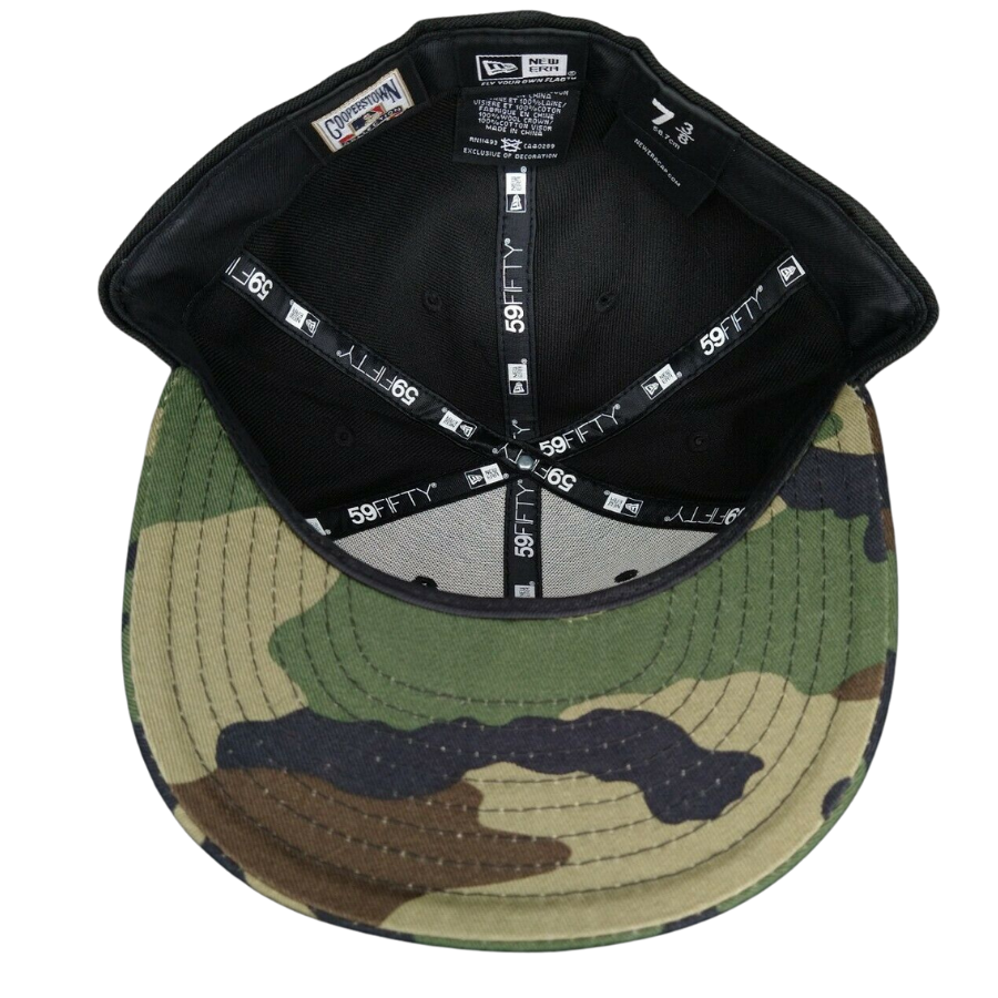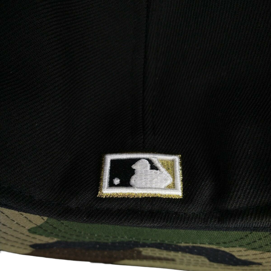 This New Era Atlanta Braves fitted hat has a black six panel structured high crown, embroidered eyelets and fabric squatchee button. The flat bill of the fitted cap is camouflage with a camouflage undervisor and black sweatband. The front panel features the Atlanta Braves Noc-A-Homa logo embroidered in gold and white threads. This is a Plain Jane fitted (no visible side patches or embroidery other than the New Era logo).