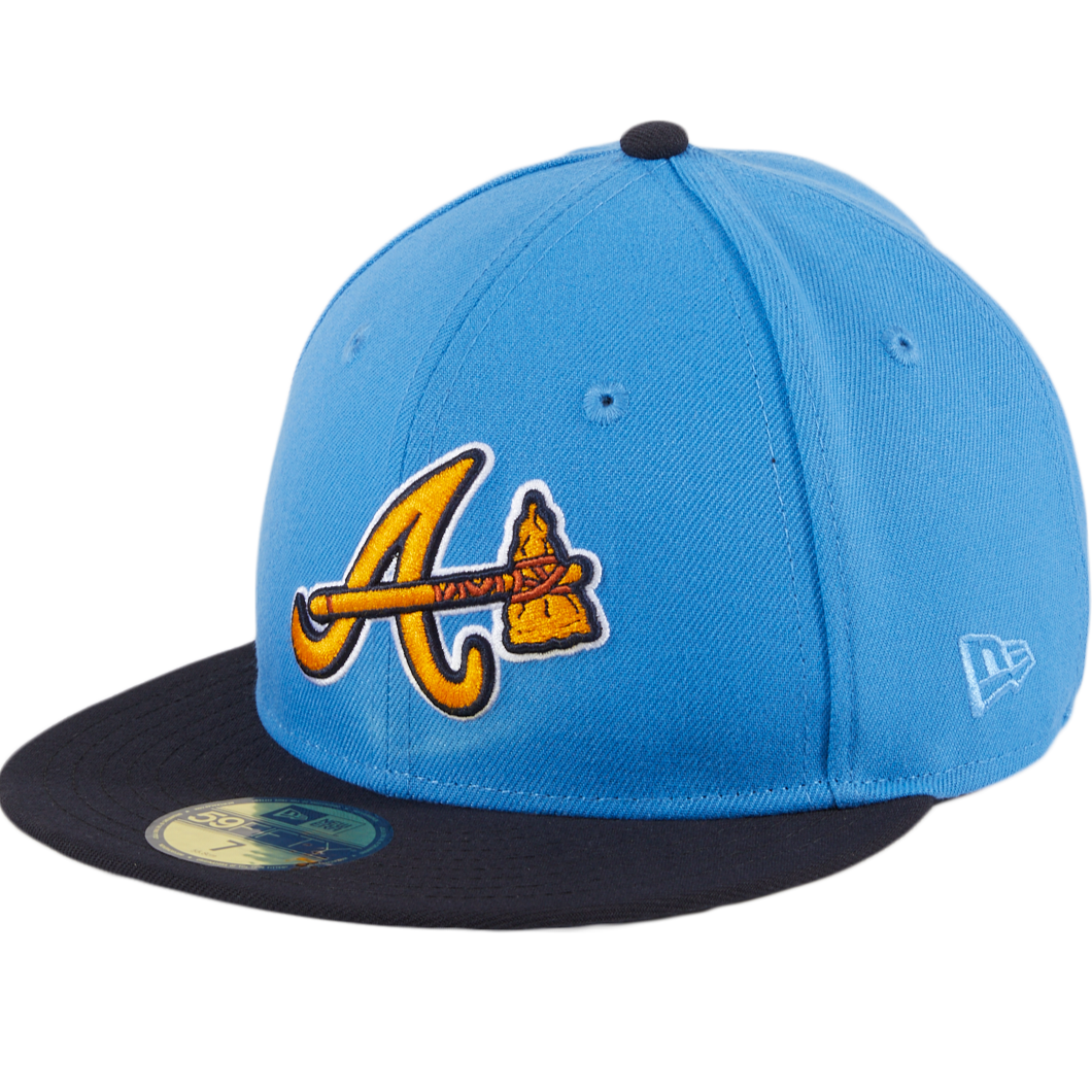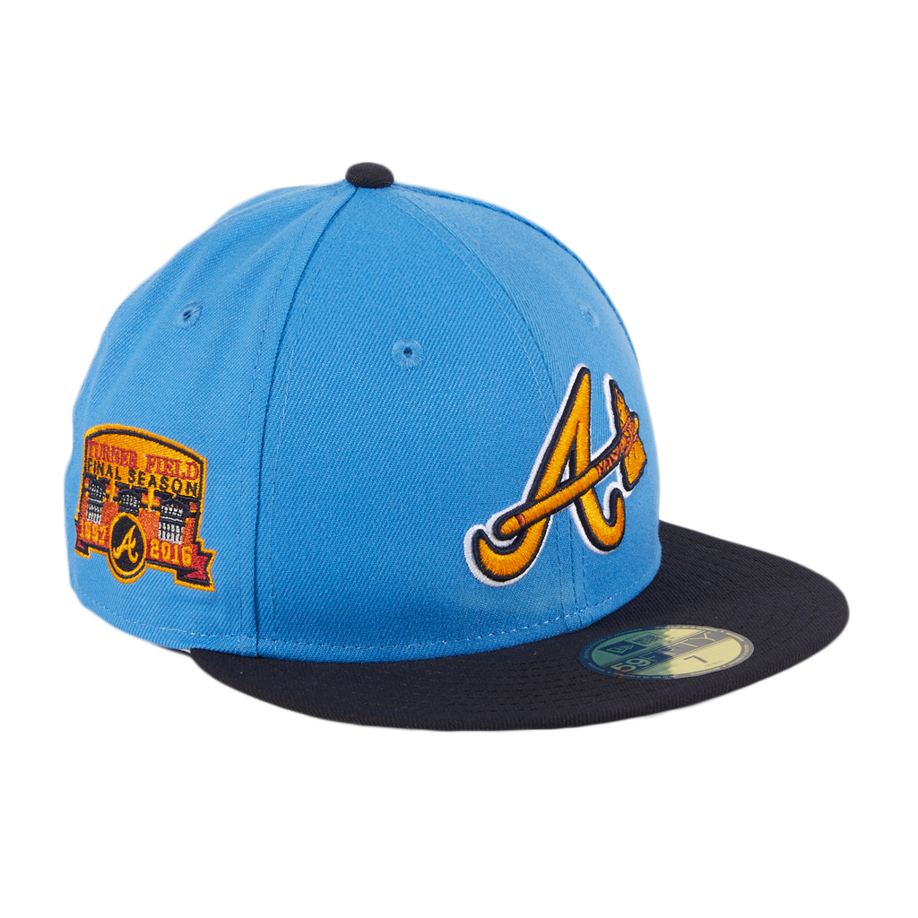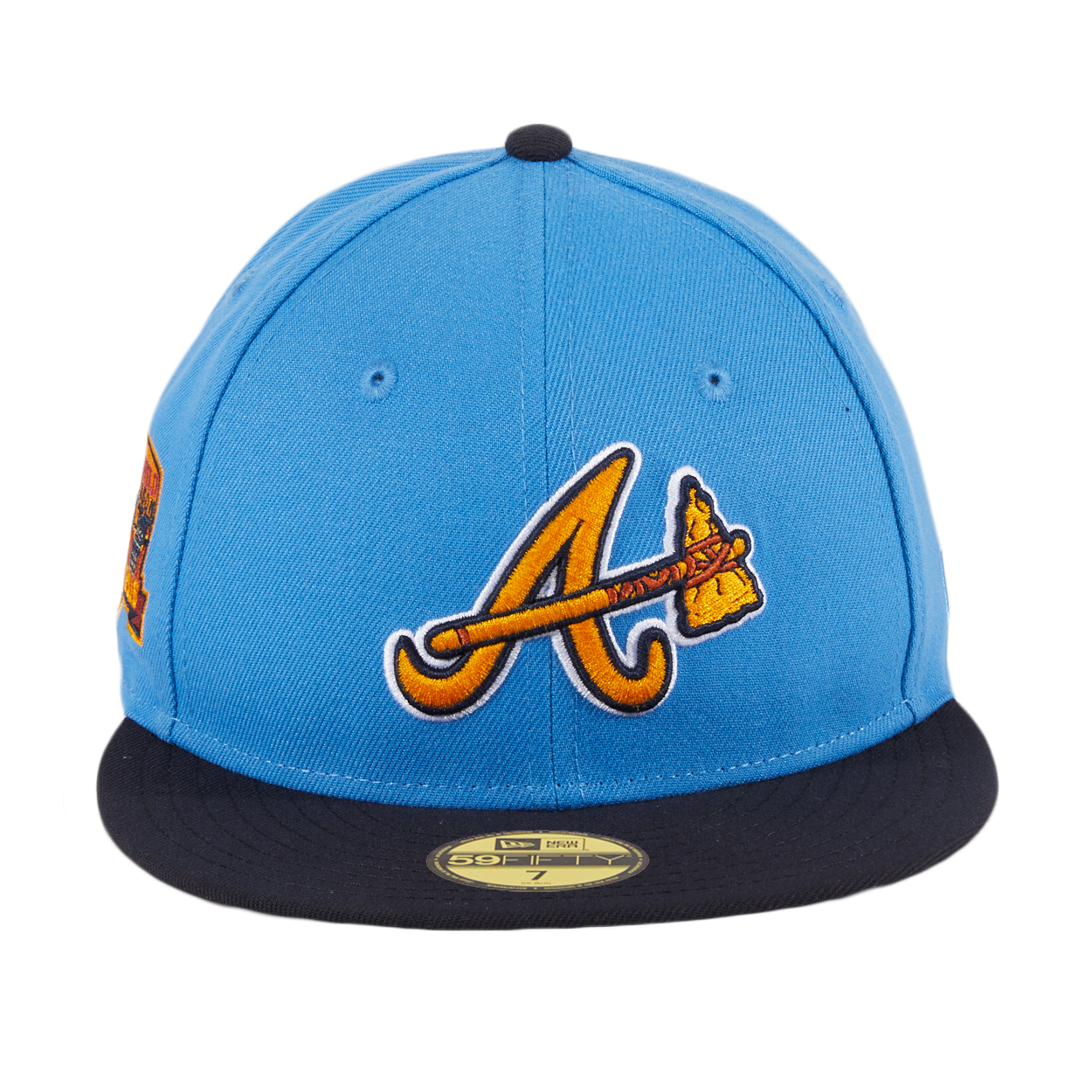 This New Era Atlanta Braves 59FIFTY fitted hat is a Hat Club exclusive part of their Breakaway collection. The fitted has a light blue high crown and embroidered eyelets. The fabric squatchee button and flat bill of the fitted is navy blue with a grey undervisor. The front panel features the Braves logo and a Final season side patch on the right panel.