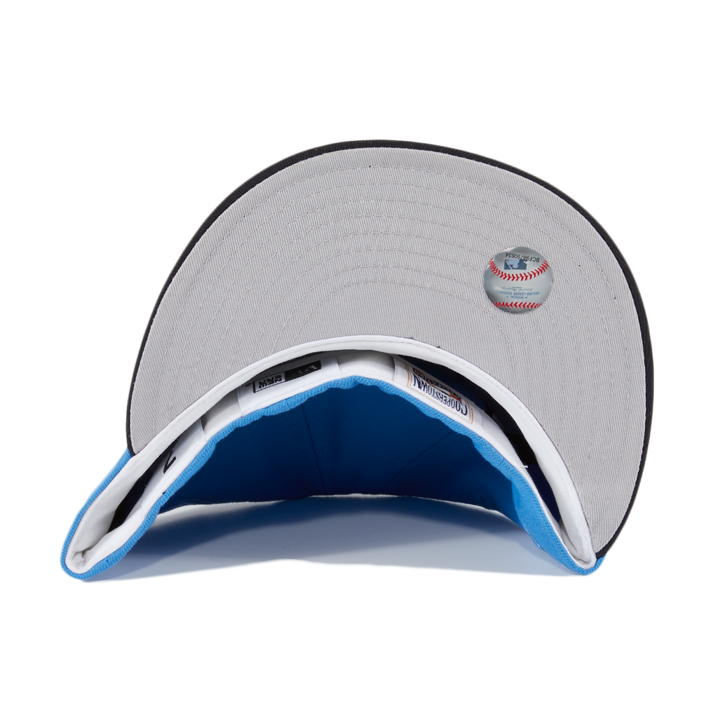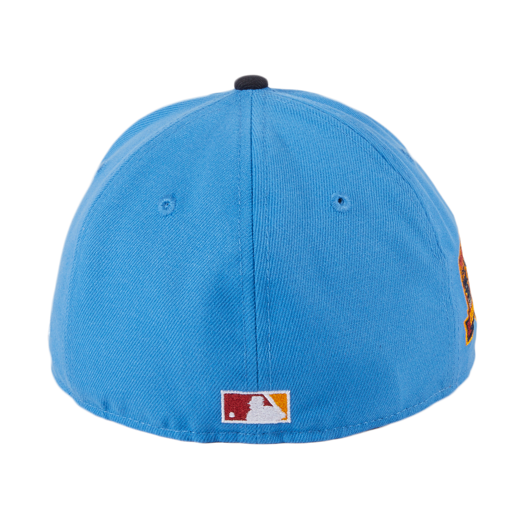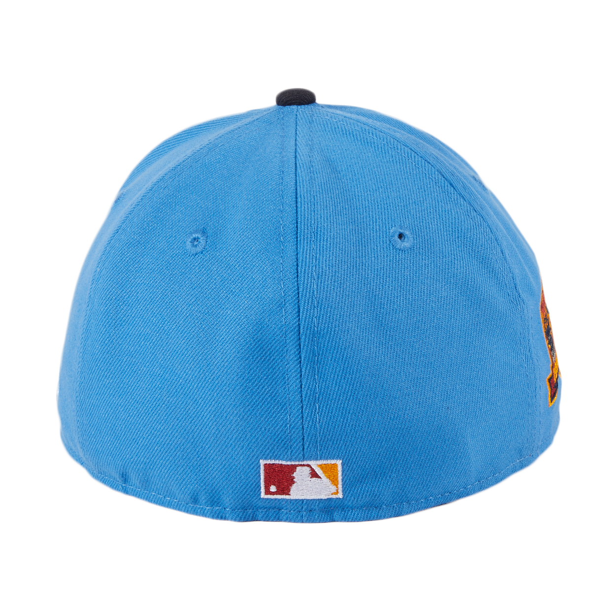 This New Era Atlanta Braves 59FIFTY fitted hat is a Hat Club exclusive part of their Breakaway collection. The fitted has a light blue high crown and embroidered eyelets. The fabric squatchee button and flat bill of the fitted is navy blue with a grey undervisor. The front panel features the Braves logo and a Final season side patch on the right panel.