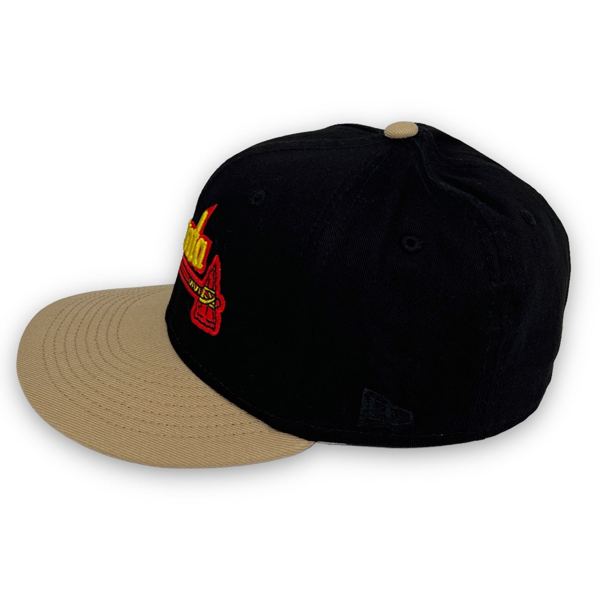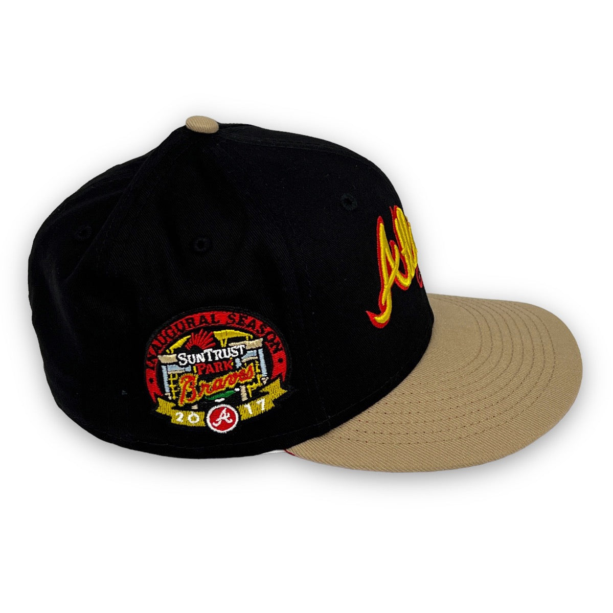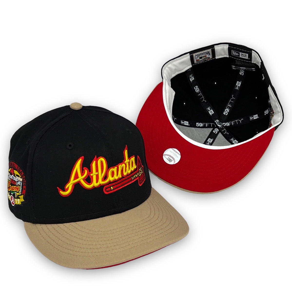 This New Era Atlanta Braves "Calligraphy Pack" 59FIFTY Fitted Hat was released by USA Cap King. The fitted has a six panel structured high crown and embroidered eyelets with a fabric squatchee button and flat bill. The front panel features the Atlanta Braves logo embroidery and a side patch on the right-wear side. The left panel of the fitted displays the New Era logo and the official MLB logo embroidery on the rear crown.