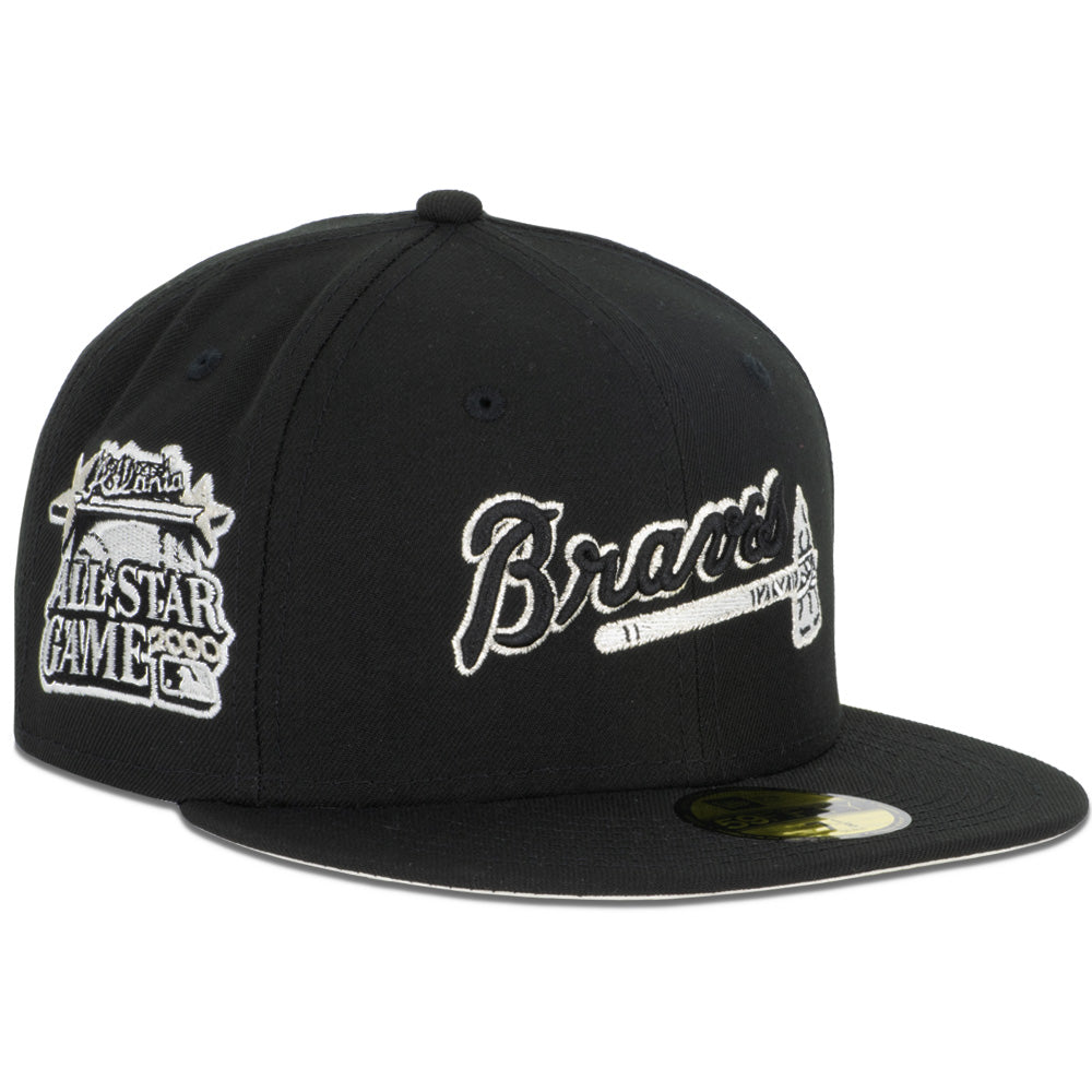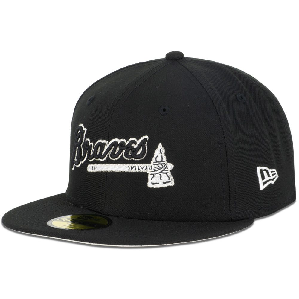 This New Era Atlanta Braves Moonshot 59FIFTY Fitted Hat was released by Just Sports. The fitted has a black six panel structured high crown and embroidered eyelets with a black fabric squatchee button. The fitted cap also has a black flat bill with a cream undervisor and white sweatband. The front panel features the Atlanta Braves logo embroidery and a side patch embroidery on the right panel. The left panel of the fitted displays the New Era logo and the official MLB Batterman logo embroidery on the rear crown.