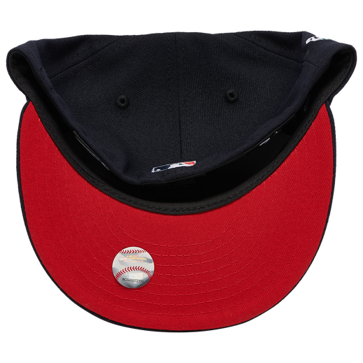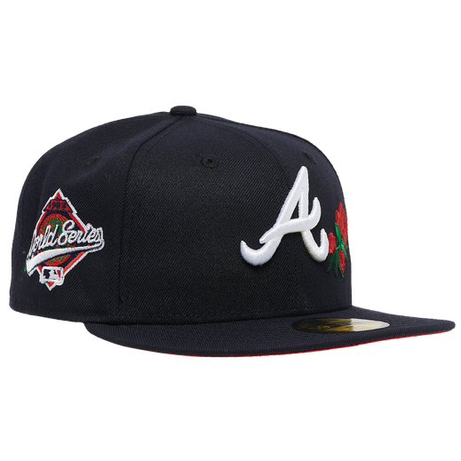 This New Era Atlanta Braves fitted hat has a navy six panel structured high crown, embroidered eyelets, fabric squatchee button and flat bill. The undervisor of the fitted cap is red with a black sweatband. The front panel features the Atlanta Braves logo embroidered in white thread with a red rose embroidered patch. The right panel features a World Series side patch embroidery.