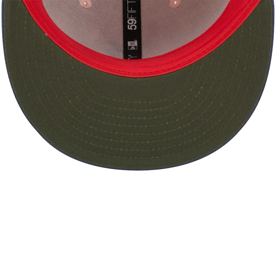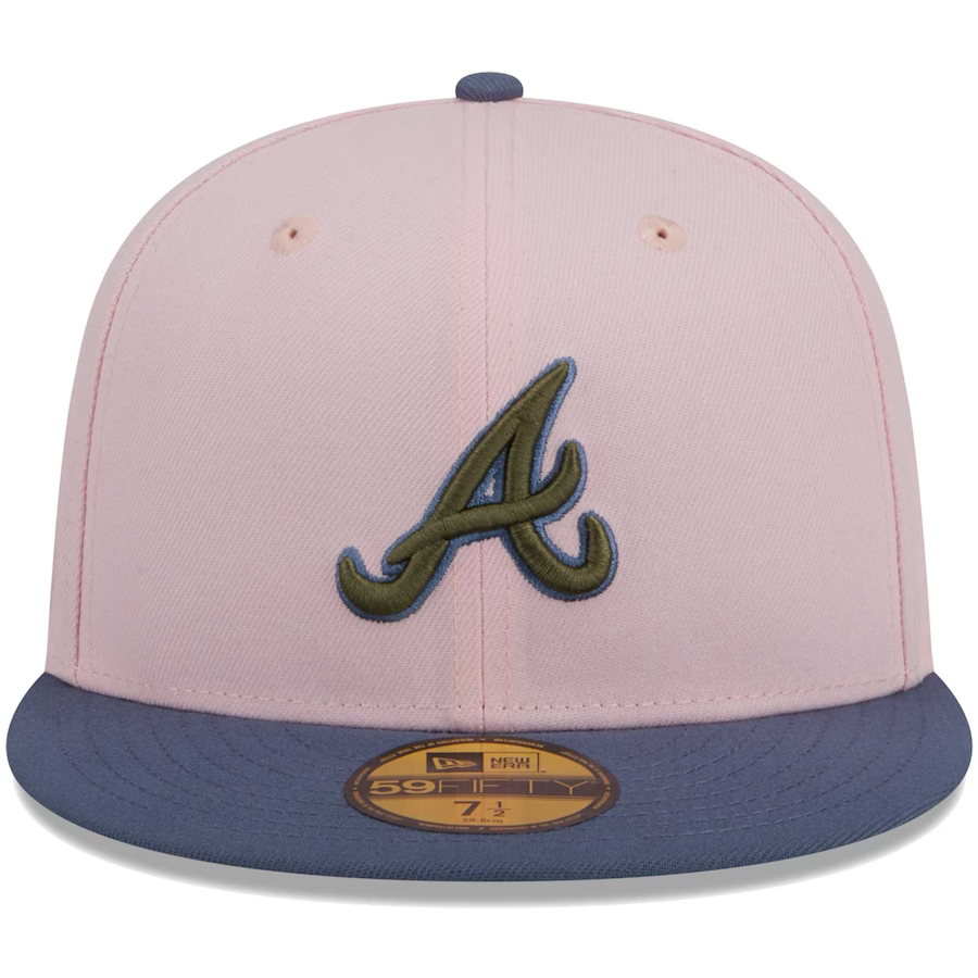 Elevate your Atlanta Braves gear with this pink and navy blue colorway New Era 59FIFTY fitted hat, adding a unique touch to your collection. With its structured construction and high crown, it offers a classic and stylish look. The hat proudly displays distinct Atlanta Braves embroidery, making it clear where your allegiance lies.