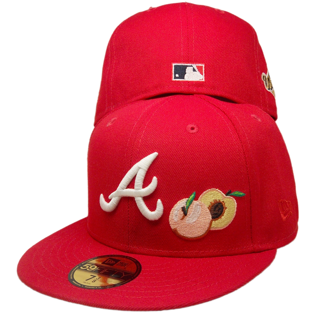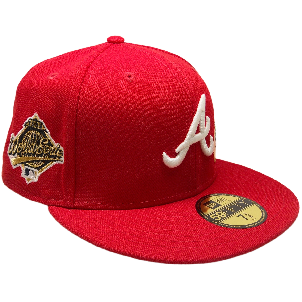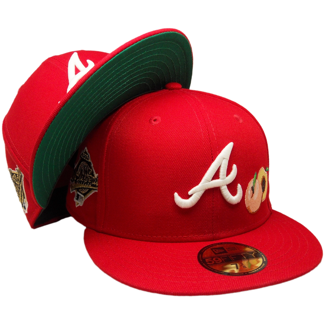 This New Era Atlanta Braves 59FIFTY fitted hat has a red six panel structured high crown, embroidered eyelets and fabric squatchee button. The fitted cap also has a red flat bill, a green undervisor and black sweatband. The front panel features the Atlanta Braves logo and a peach embroidery. The right panel features a 1995 World Series side patch embroidery.