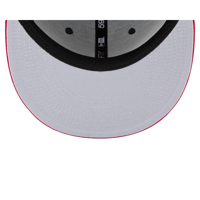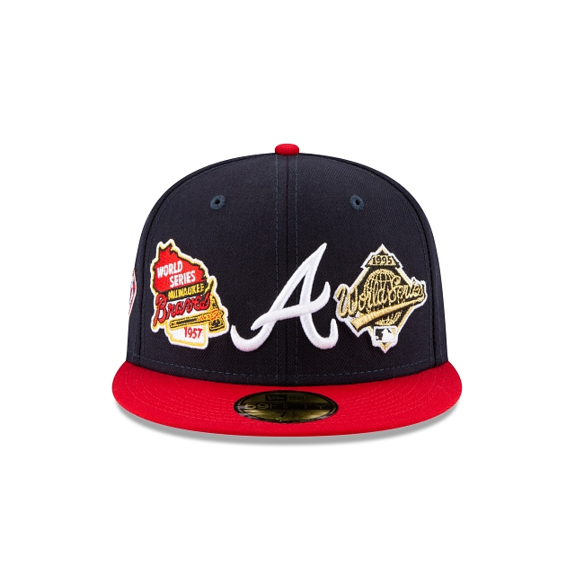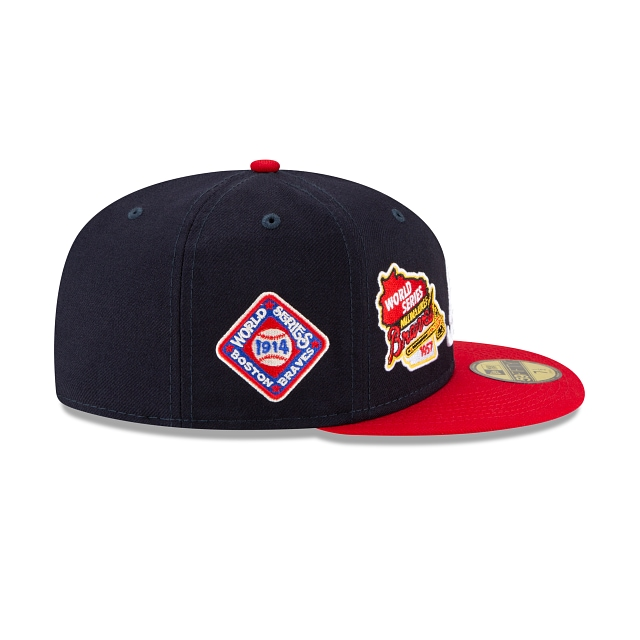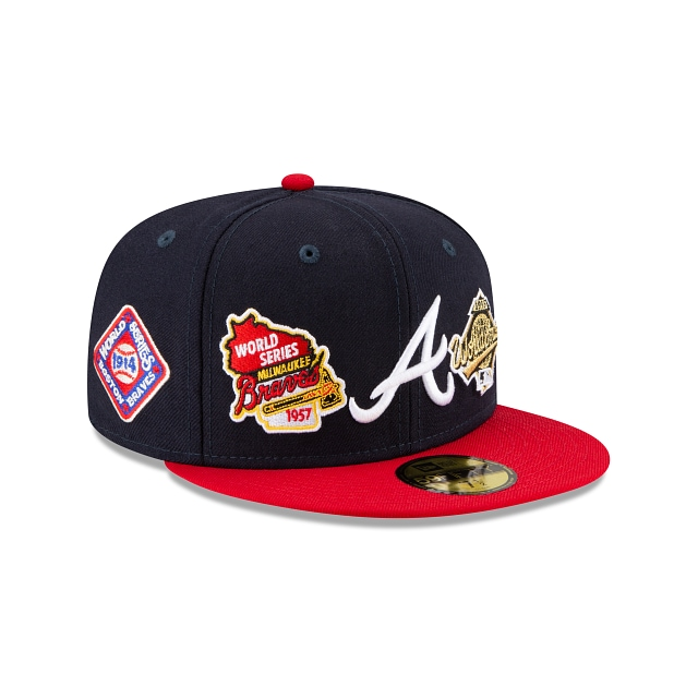 The Atlanta Braves World Champions 59FIFTY Fitted Cap features an embroidered Braves logo at the front panels with World Series patches embroidered throughout the crown, and a World Series script at the rear, celebrating the franchise's legacy.