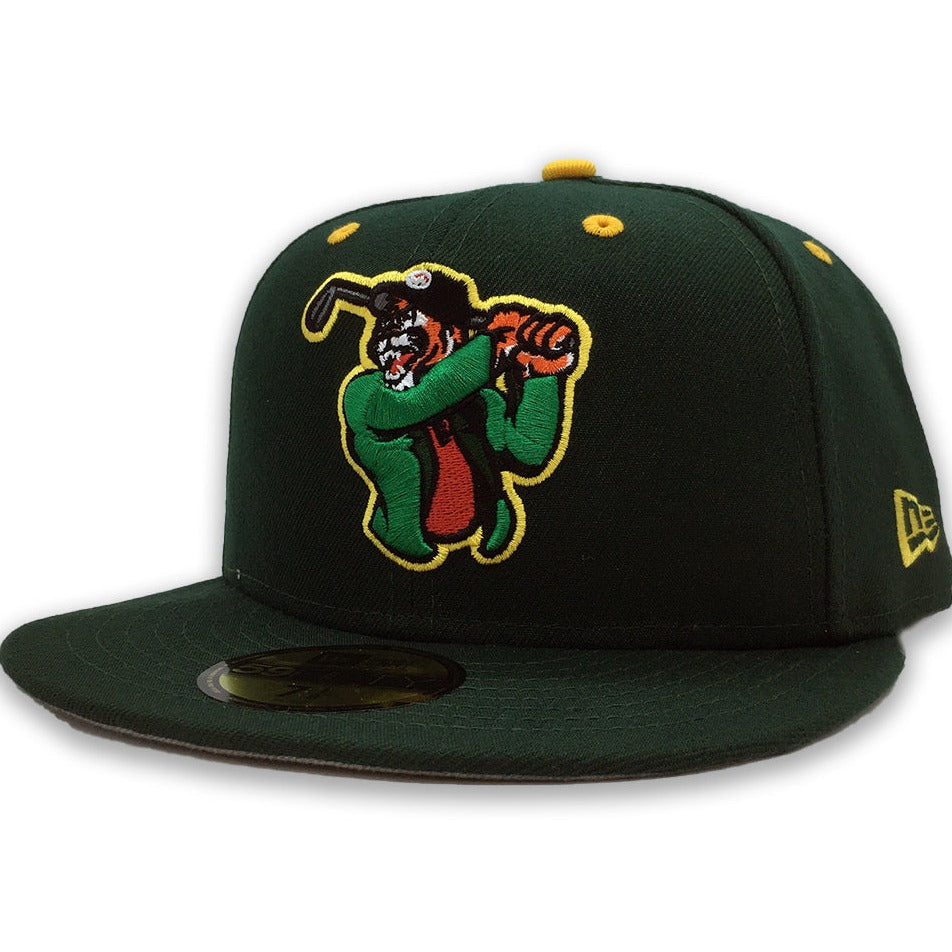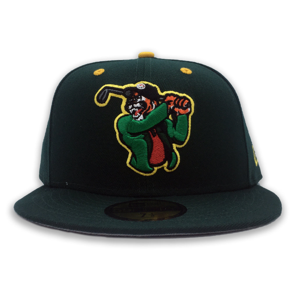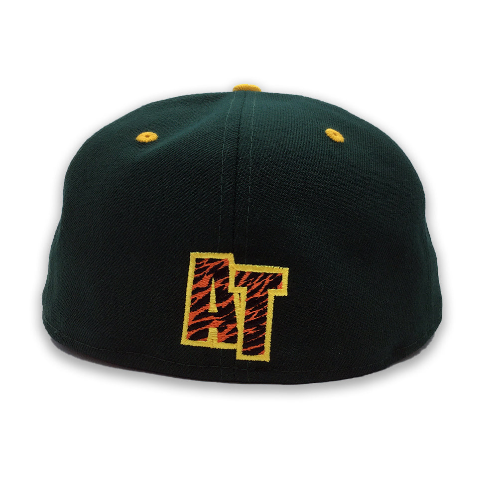 This New Era Augusta Tigers 59FIFTY fitted hat was released by Source Teamworks. The fitted has a dark green six panel structured high crown, yellow embroidered eyelets and a yellow fabric squatchee button. The flat bill of the cap is also dark green with a grey bottom undervisor. The front panel includes the Augusta Tigers logo embroidered in orange and green stitching.