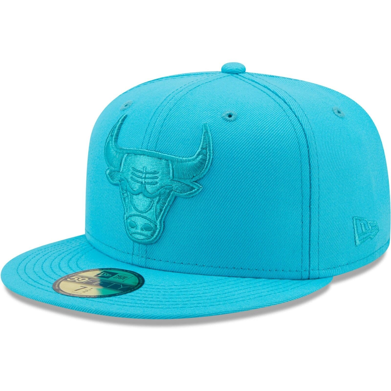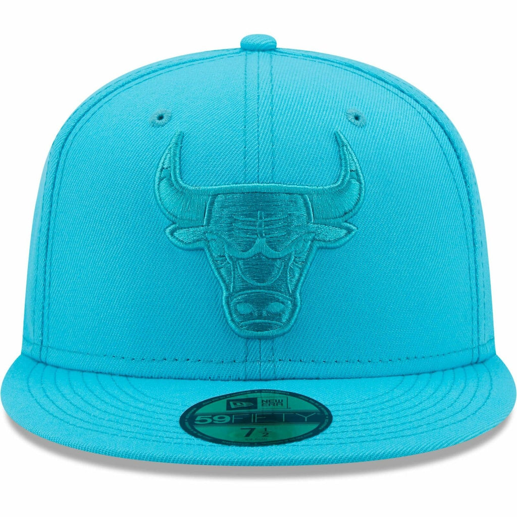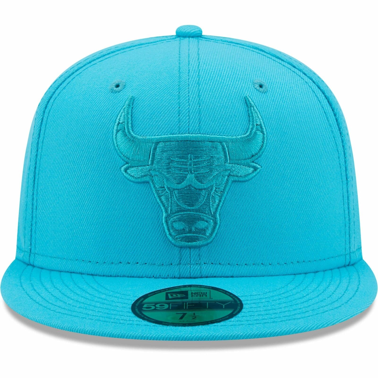 The New Era Baby Blue Chicago Bulls 59Fifty Fitted Hat is truly solid baby blue colorway. There is no hint of any other color. All 6 panels which makes up the crown, the 6 embroidered eyelets, fabric squatchee button, brim and undervisor is baby blue. The New Era logo on the left and the official NBA badge located on the back is also baby blue.