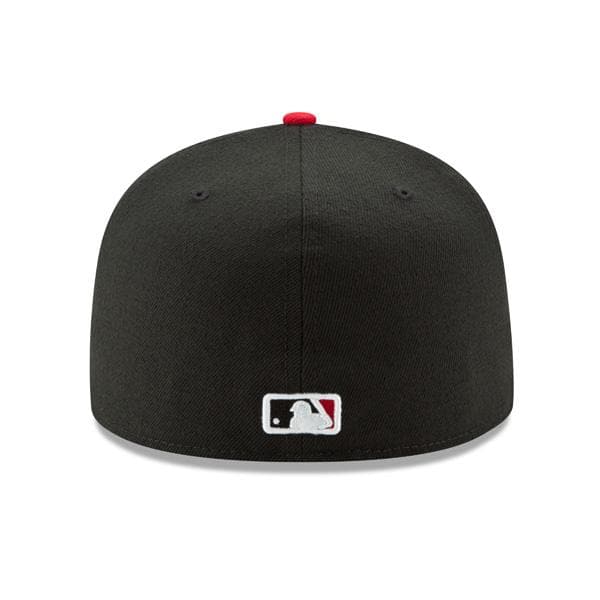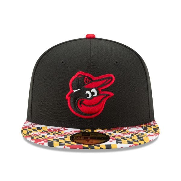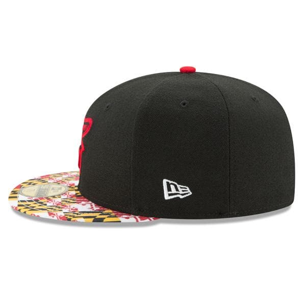 The New Era Baltimore Orioles 59FIFTY fitted hat has a black and red colorway. The six panel structured crown and embroidered eyelets are black. The fabric squatchee button located at the top of the hat is red. The flat bill features a pattern of Maryland flag which is red, black, yellow and white in color. The left panel displays the New Era "Fly Your Own Flag" logo embroidered in white thread. The front panel features the MLB team Baltimore Orioles "The Oriole Bird" head embroidered in black and red thread. The back of the crown features the official MLB Batterman logo in red, white and blue threads.