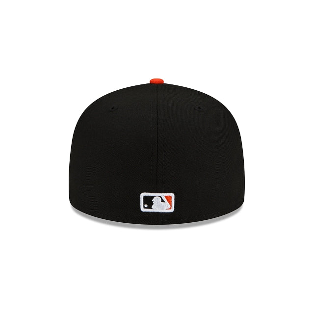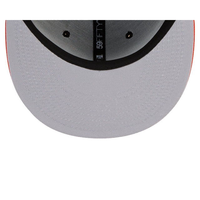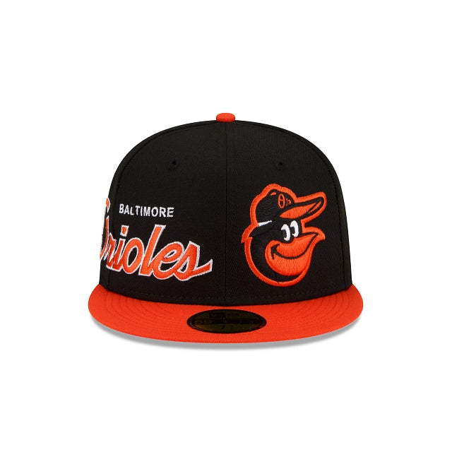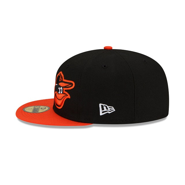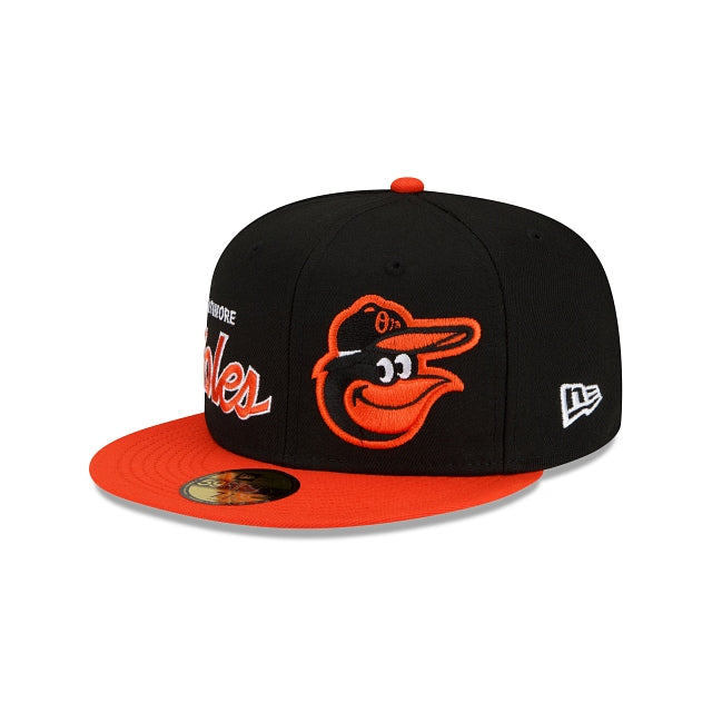 The Baltimore Orioles Double Logo 59FIFTY Fitted Cap features a two tone team fabrication with an embroidered Orioles logo at the front left-wear panel, complimented by a team script at the right-wear side and a matching MLB Batterman logo at the rear.