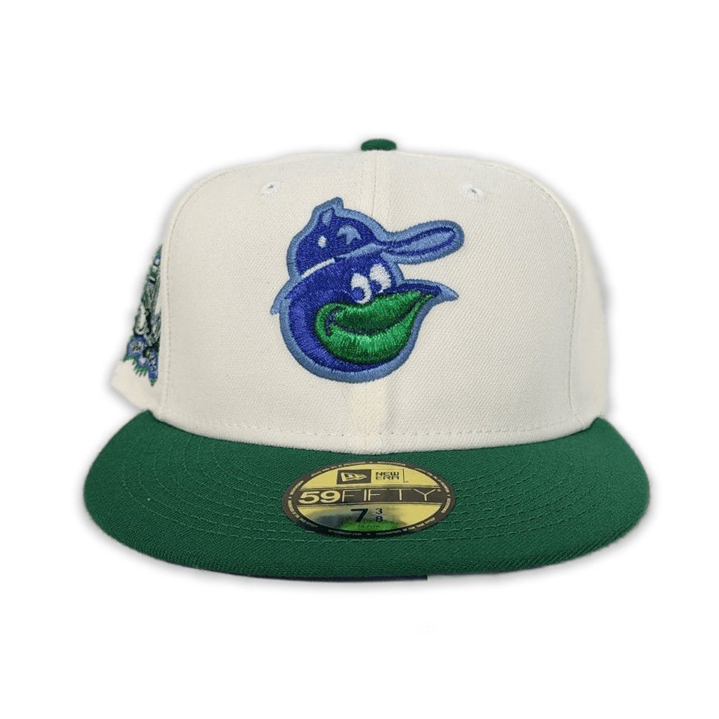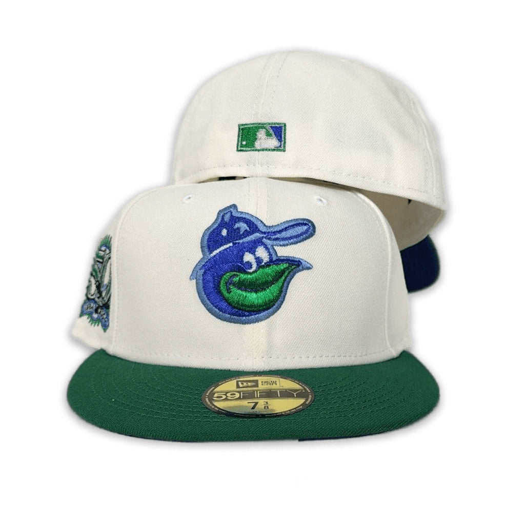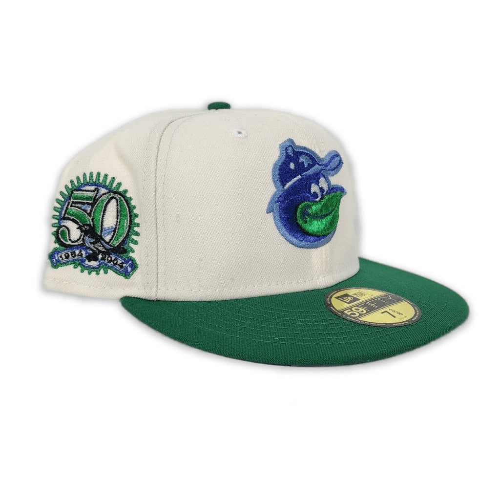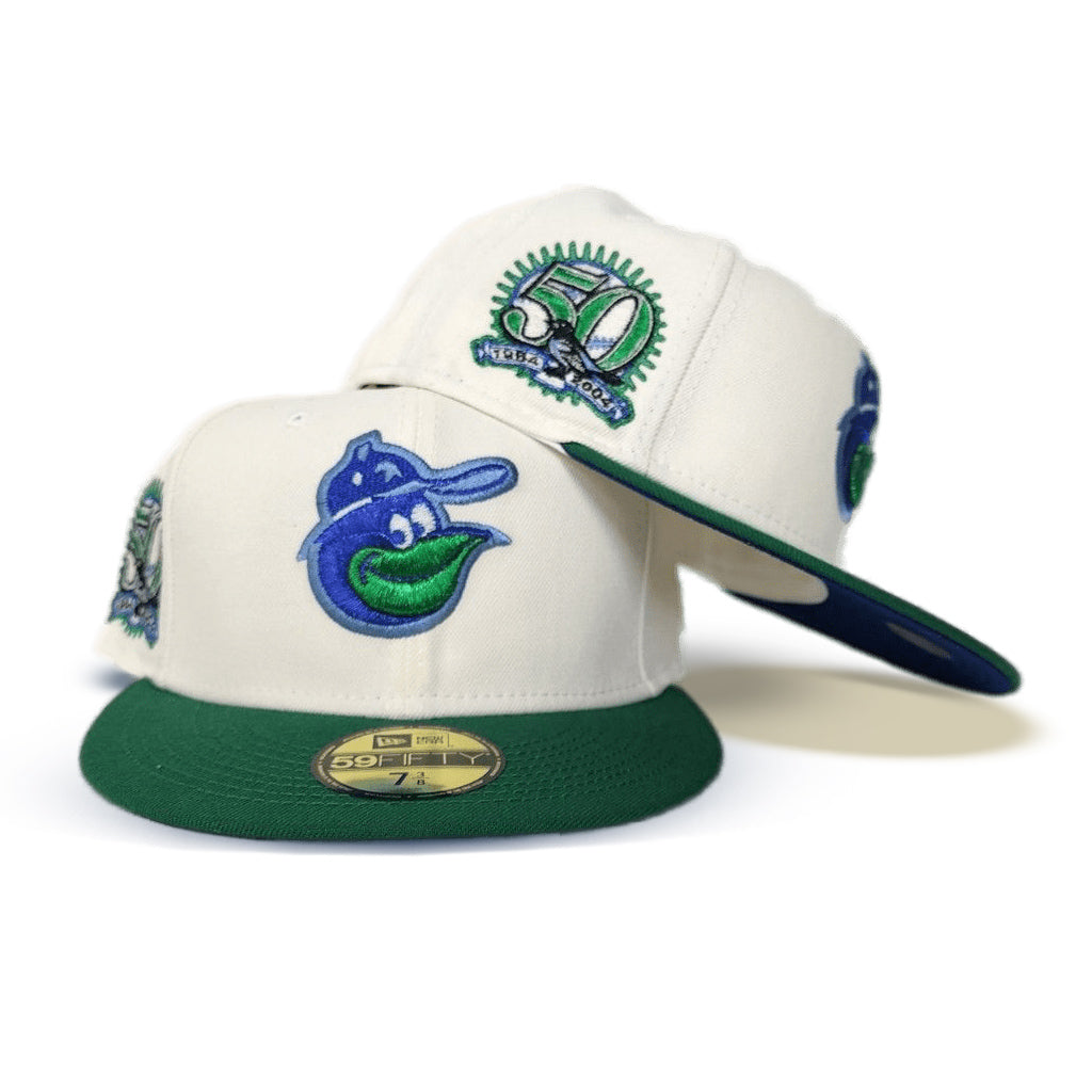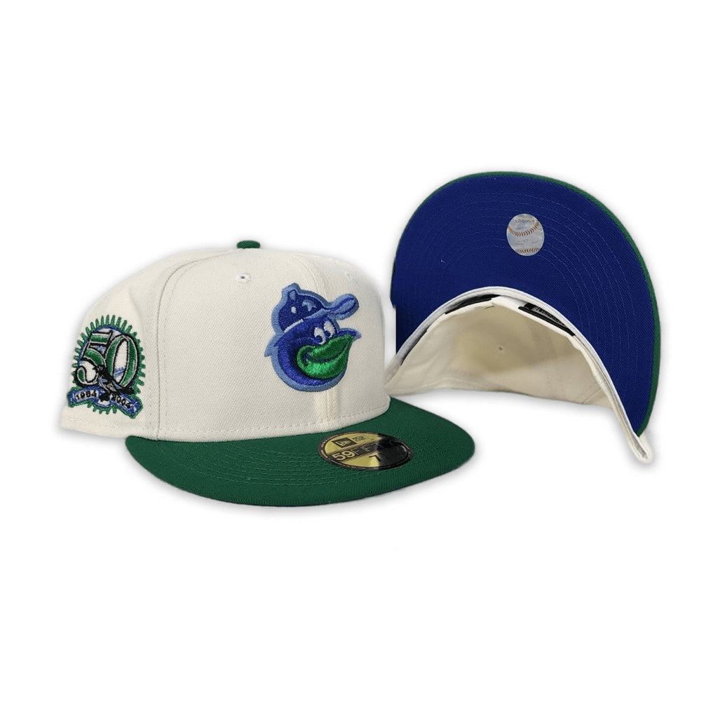 This New Era Baltimore Orioles Off-White/Green/Royal Blue 50th Anniversary 59FIFTY Fitted Hat has a off-white six panel structured high crown and embroidered eyelets with a green fabric squatchee button. The fitted cap has a green flat bill with a royal blue undervisor and white sweatband. The front panel features the Baltimore Orioles logo embroidery and a 50th Anniversary side patch embroidery on the right panel. The left panel of the fitted displays the New Era logo and the official MLB logo embroidery on the rear crown.