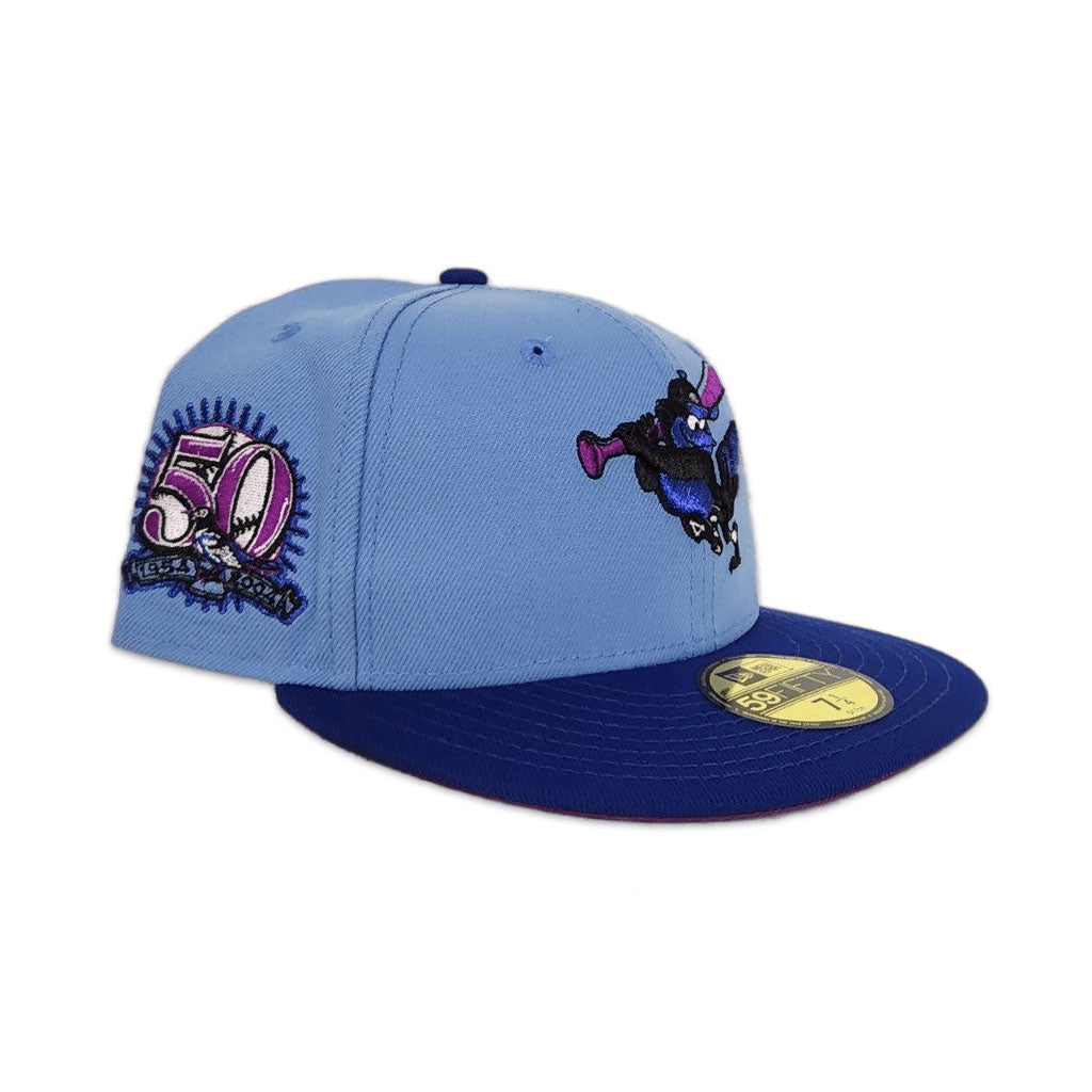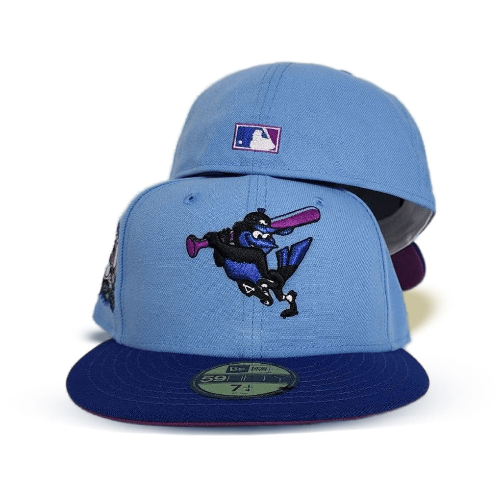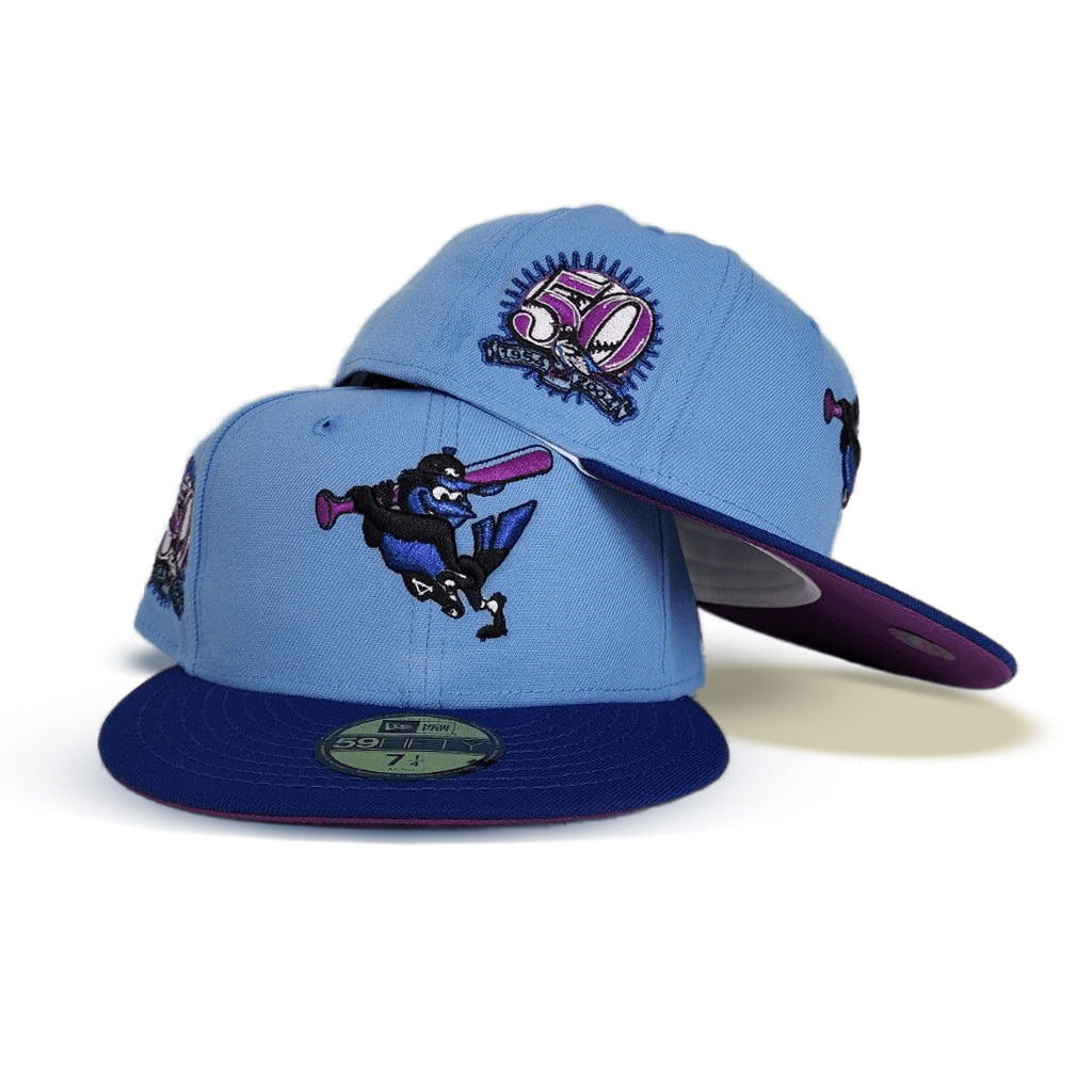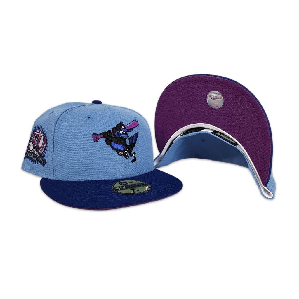 This New Era Baltimore Orioles Sky Blue/Royal 50th Anniversary 59FIFTY Fitted Hat has a sky blue six panel structured high crown and embroidered eyelets with a royal blue fabric squatchee button. The fitted cap has a royal blue flat bill with a grape undervisor and white sweatband. The front panel features the Baltimore Orioles logo embroidery and a 50th Anniversary side patch embroidery on the right panel. The left panel of the fitted displays the New Era logo and the official MLB logo embroidery on the rear crown.