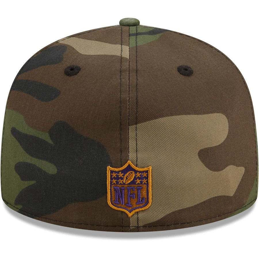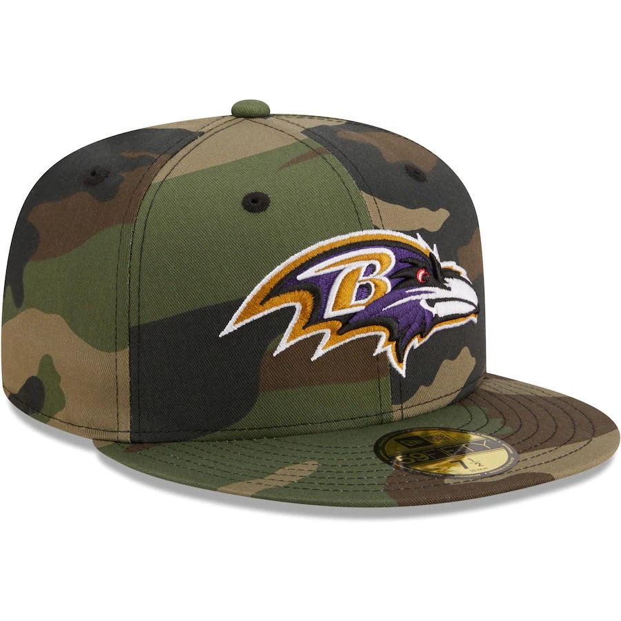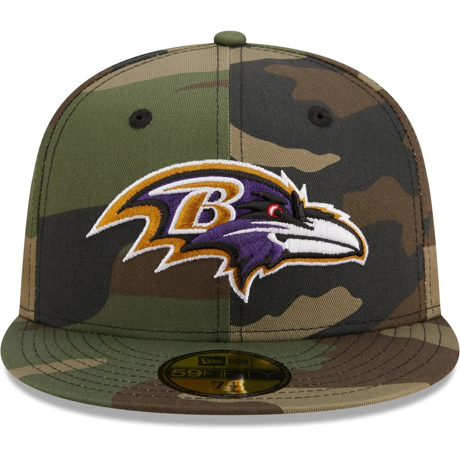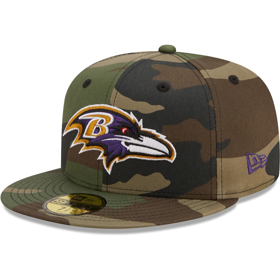 Stay shaded in bold Baltimore Ravens style with this Woodland 59FIFTY hat. This New Era headwear features an embroidered logo over a striking camo pattern. With a contrast undervisor for an extra dash of team color, this fitted cap is a must-have for any Baltimore Ravens game day attire.