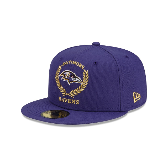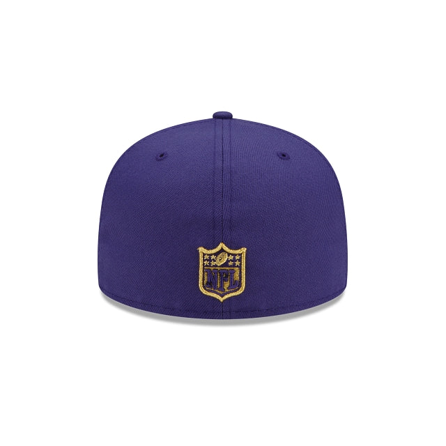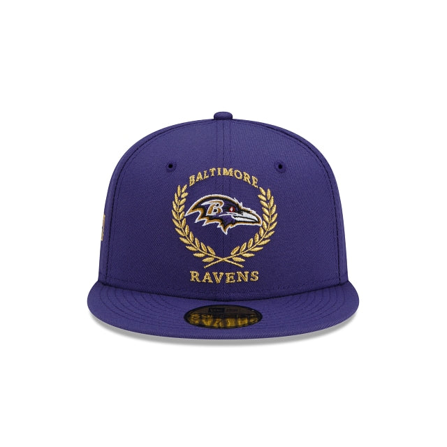 The Baltimore Ravens Gold Classic 59FIFTY Fitted Cap features an embroidered Ravens insignia at the front panels with a league specific patch at the right-wear side and the NFL Shield at the rear.