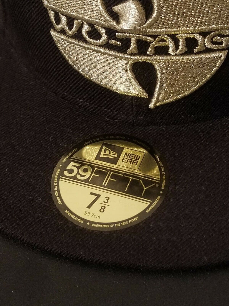 Wu Tang Clan aint nothing to mess with. This New Era 59Fift Wu Tang fitted hat has a black and silver colorway. The entire fitted including the structured high crown, embroidered eyelets, fabric squatchee button and flat brim is black in color with a Kelly green bottom undervisor. The legendary Wu tang logo is embroidered in silver thread. The equally legendary New Era logo on the left panel of the fitted is embroidered in black thread. On the back of the fitted is the wordmark "Wu Tang" embroidered in silver thread.