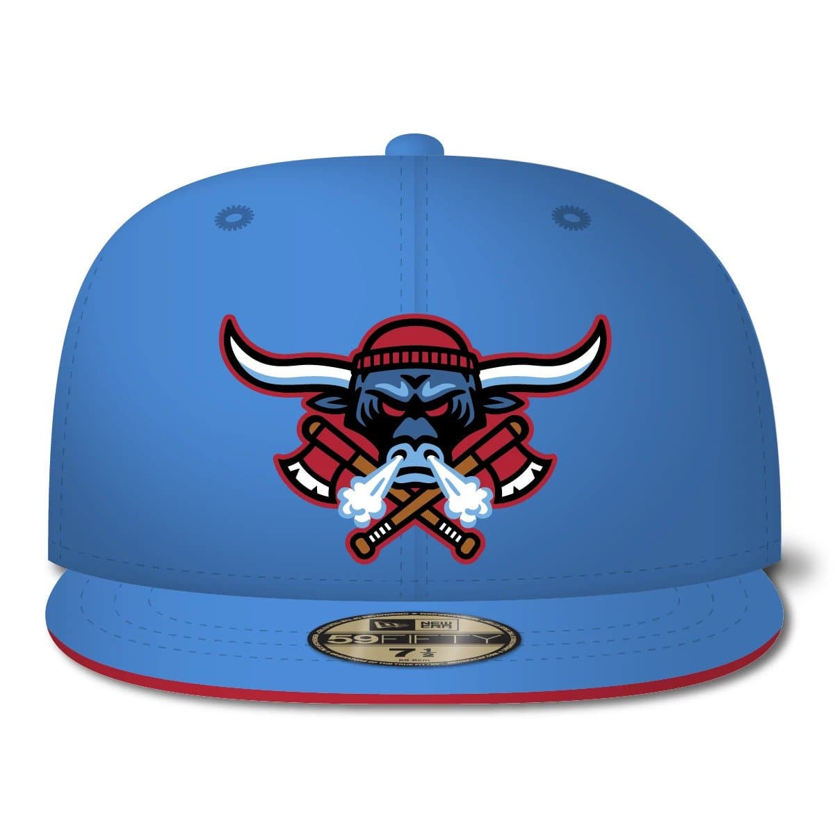 The New Era Big Blue Ox 59FIFTY Fitted Hat was design by David. The Big Blue Ox 59FIFTY has a sky blue, red & white colorway. The structured 6 panel high crown, embroidered eyelets and fabric squatchee button are all sky blue. The flat brim of the fitted is also sky blue with a red bottom undervisor. The front logo features a a blue ox with glowing red eyes wearing a winter skully with smoke blowing from it's nostrils and a double crossed axe.