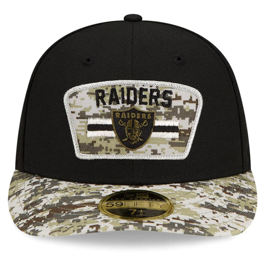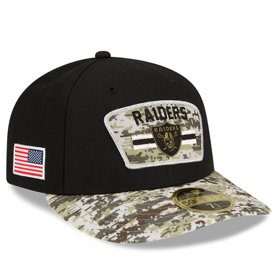 Honor our service members while supporting your favorite team in this year's Official NFL Salute To Service Collection. This two-tone Low Profile 59FIFTY Fitted Hat is constructed of black polyester on the crown and a camo patterned polyester fabric on the visor. The front crown features a fabric applique with custom Las Vegas Raiders art. This patch uses the same camo fabric from the visor and is surrounded with contrasting team color embroidery. Finishing touches include an embroidered American flag patch on the right wear and the official NFL ''Salute to Service'' patch on the rear. Join your favorite Las Vegas Raiders players as they wear this cap on the field during the month of November! The NFL does not profit from the sale of Salute to Service products. Charitable contributions are awarded by the NFL Foundation to the NFL's military nonprofit partners. For more information, please visit www.NFL.com/causes/salute.